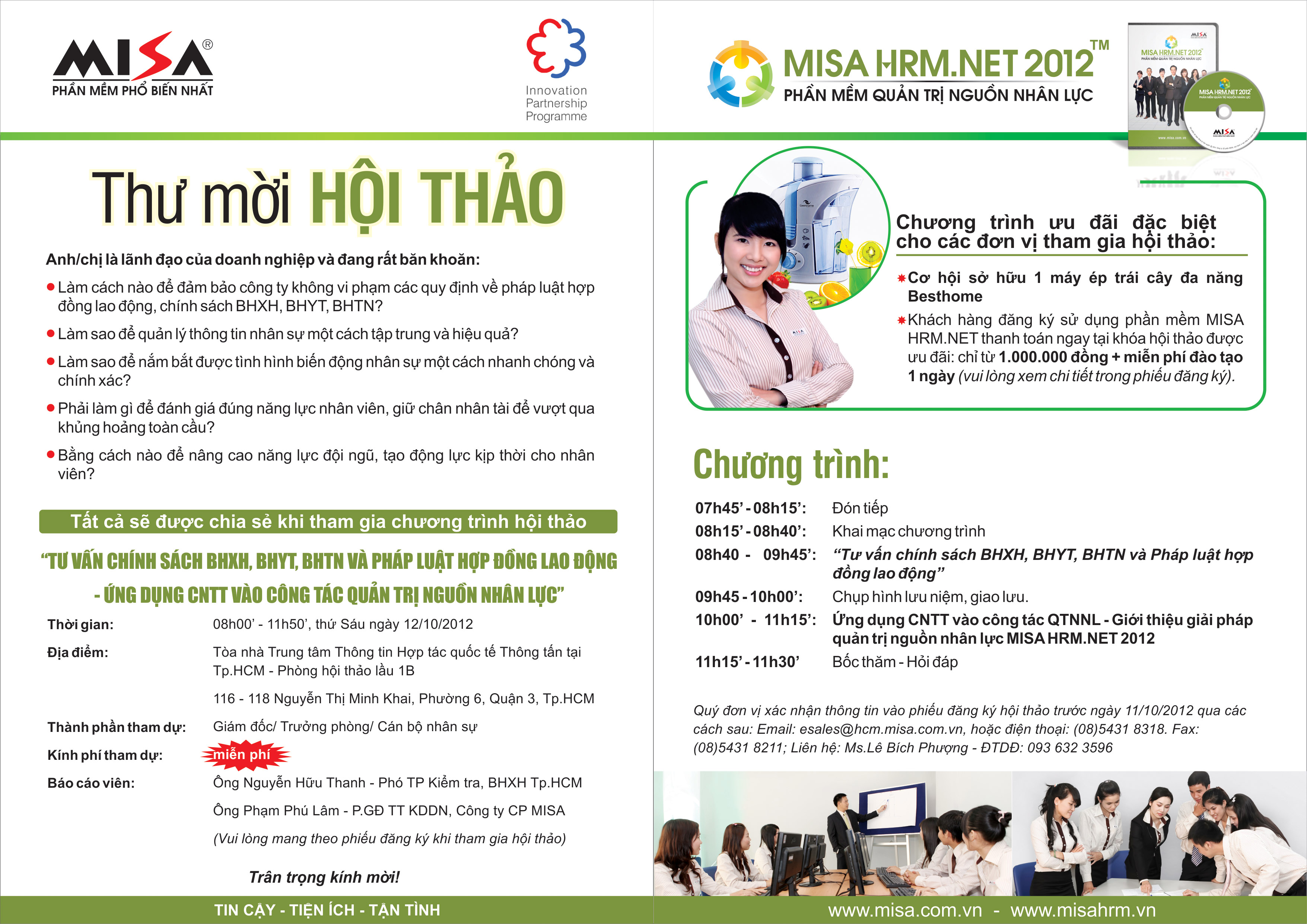 Nằm trong chuỗi hoạt động hỗ trợ doanh nghiệp, ngày 12/10/2012 tại Tp.HCM, Công ty Cổ phần MISA phối hợp ông Nguyễn Hữu Thanh – phó trưởng phòng kiểm tra, Bảo hiểm xã hội Tp.HCM tổ chức chương trình hội thảo tư vấn giải đáp các vướng mắc liên quan đến pháp luật hợp đồng lao động – Bảo hiểm xã hội – Bảo hiểm Y tế – Bảo hiểm thất nghiệp. Ngoài ra, Công ty Cổ phần MISA còn tư vấn giải pháp Công nghệ thông tin ứng dụng vào công tác Quản trị nguồn nhân lực giúp các doanh nghiệp nâng cao hiệu quả, giảm thiểu thời gian và nhân lực.