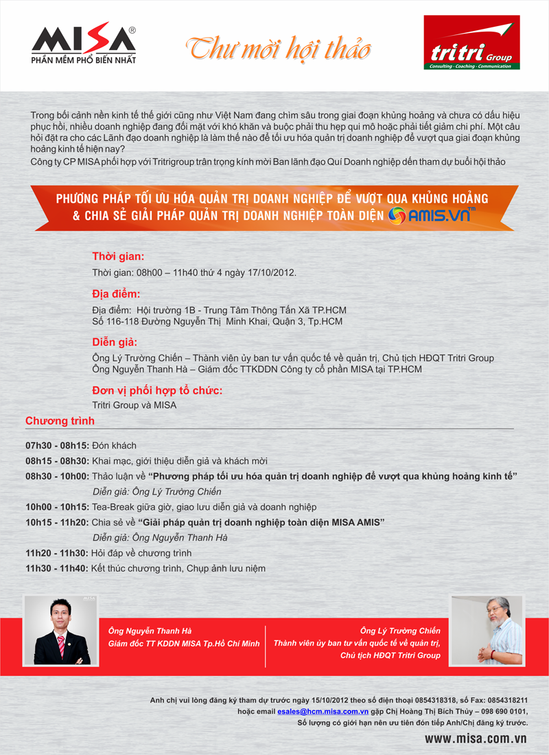 Nhằm giải đáp các khó khăn, vướng mắc của doanh nghiệp thời kỳ khủng hoảng, ngày 17/10, Công ty Cổ phần MISA phối hợp với diễn giả Lý Trường Chiến -Thành viên ủy ban tư vấn quốc tế về quản trị, Chủ tịch HĐQT Tritri Group tổ chức chương trình hội thảo: