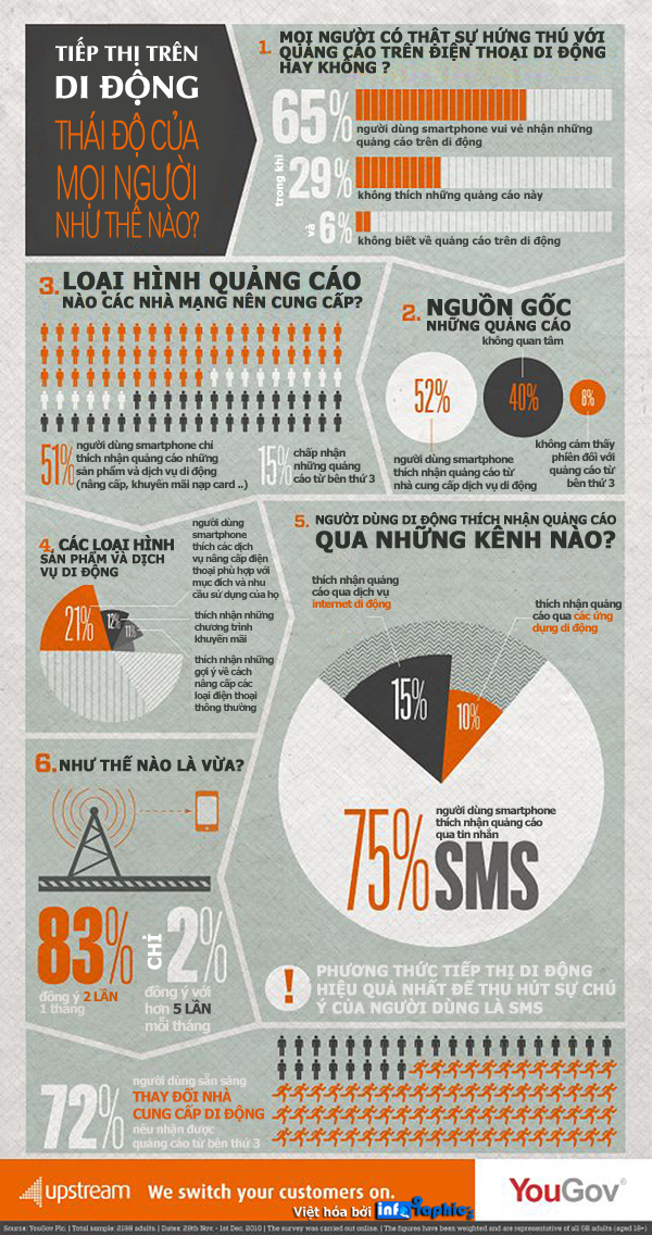 Do vậy mà quảng cáo qua SMS như thế nào, lưu lượng bao nhiêu, thực sự là những vấn đề quan trọng đặt ra cho những nhà quảng cáo trên di động. Dựa trên những nghiên cứu của YouGov, bài infographic sau sẽ cho chúng ta thấy những thái độ của người sử dụng đối với quảng cáo trên di động thông qua SMS.
