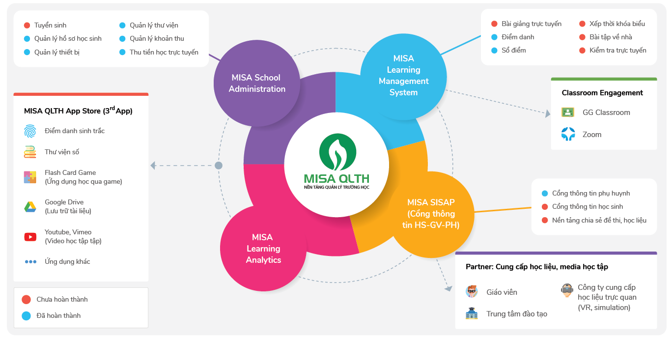 MISA phát triển hệ sinh thái hợp nhất mọi nghiệp vụ Quản lý – Học trực tuyến – Cổng thông tin kết nối trên một hệ thống. Điều này sẽ giúp các đơn vị giáo dục có thể phát triển nền tảng hỗ trợ dạy và học từ xa, ứng dụng triệt để công nghệ số trong công tác quản lý, giảng dạy, học tập cũng như số hóa tài liệu, giáo trình, xây dựng nền tảng chia sẻ tài nguyên giảng dạy, học tập theo cả hình thức trực tiếp và trực tuyến.