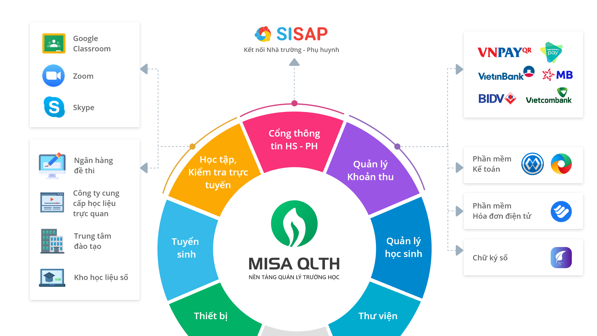 Theo chủ trương thanh toán học phí và các khoản thu không dùng tiền mặt của Chính phủ, MISA QLTH đã kết nối hệ thống nhiều ngân hàng lớn, trung gian thanh toán như Vietcombank, Vietinbank, BIDV, MSB, VNPAY hay ví điện tử ViettelPay, để phụ huynh có thể nộp học phí trực tuyến, không cần mất thời gian chờ đợi tại trường. Điều này còn hỗ trợ nhà trường tự động ghi nhận biến động khoản thu và làm báo cáo nhanh chóng, chính xác hơn.
