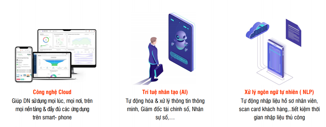 Ứng dụng những công nghệ mới 4.0 mới nhất như Cloud, AI, Big Data, Blockchain…, MISA AMIS mang đến trải nghiệm mới về làm việc và điều hành thông minh cho người dùng. Cụ thể, dựa trên Cloud, MISA AMIS giúp nhân sự làm việc được bất cứ lúc nào và ở đâu với nhiều thiết bị khác nhau (PC, laptop, tablet, mobile), tạo thành mô hình văn phòng di động. Thông qua việc tự động tổng hợp và phân tích dữ liệu của MISA AMIS, trên cơ sở công nghệ Big Data và AI, sẽ giúp doanh nghiệp nâng cao 47% hiệu suất làm việc của nhân viên.