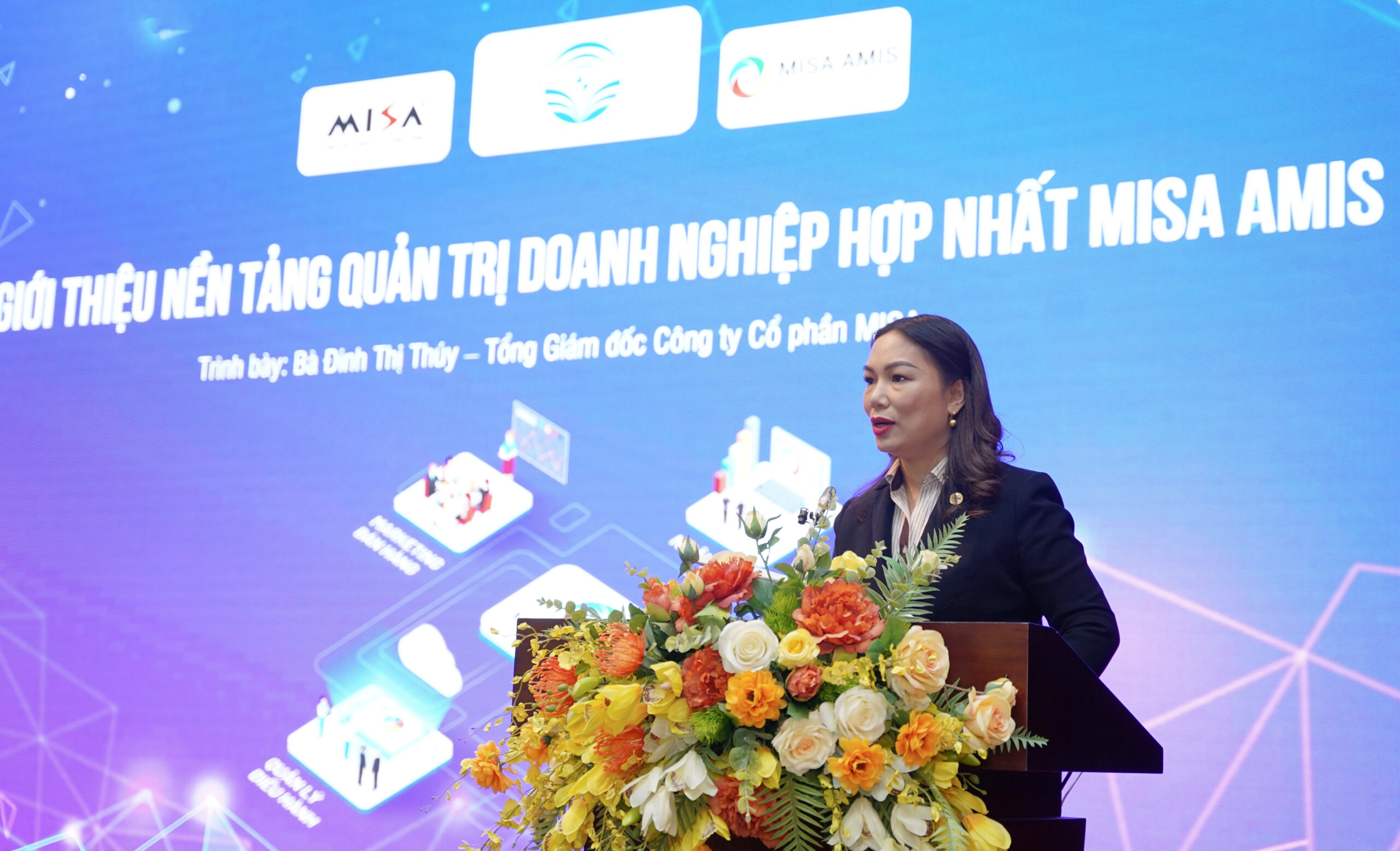 Bà Đinh Thị Thúy – Tổng Giám đốc MISA giới thiệu về nền tảng và khẳng định cam kết luôn đồng hành cùng các doanh nghiệp chuyển đổi số của đội ngũ gần 2500 nhân sự MISA