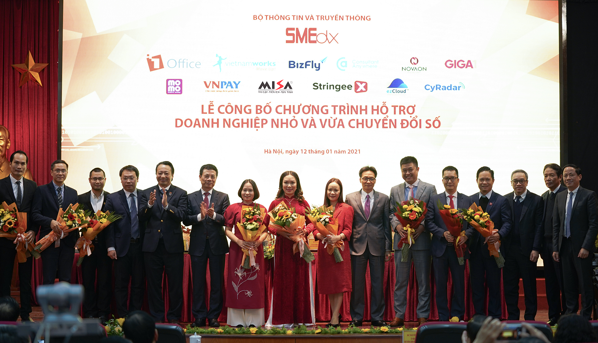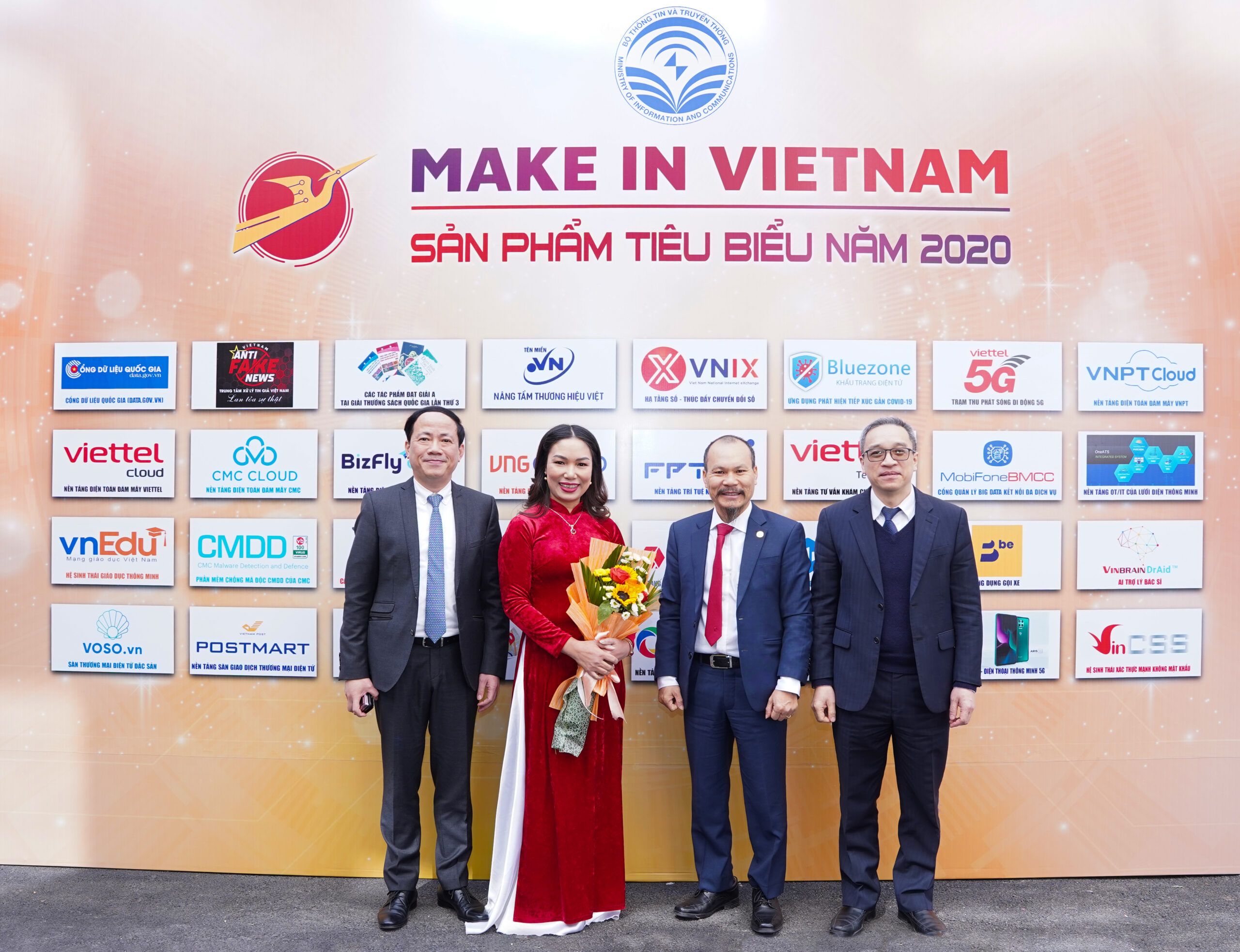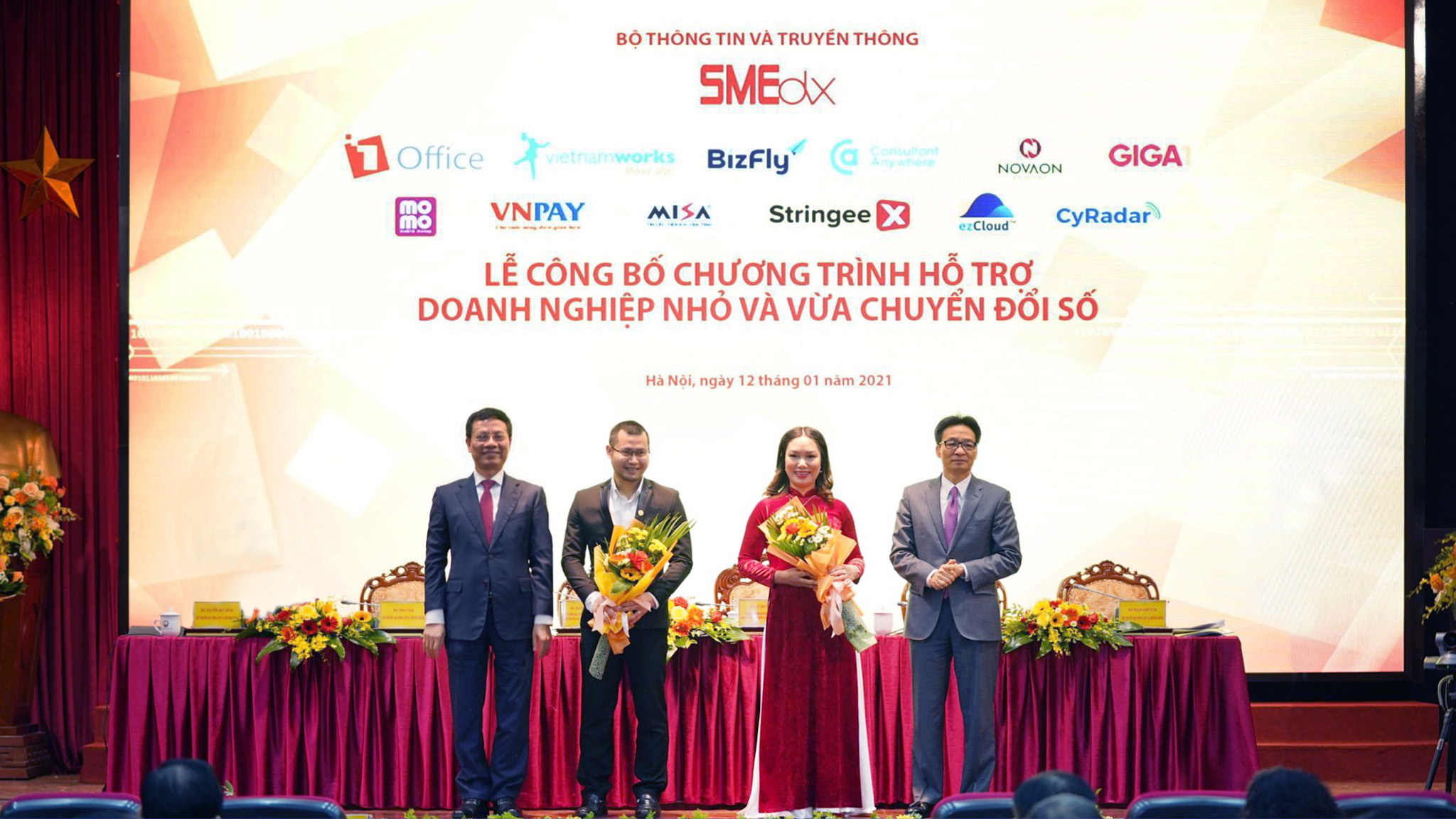 Tổng Giám đốc MISA Đinh Thị Thúy đại diện công ty nhận hoa từ Phó Thủ tướng Vũ Đức Đam (ngoài cùng bên phải) và Bộ trưởng Bộ Thông tin và Truyền thông Nguyễn Mạnh Hùng (ngoài cùng bên trái) tại Lễ công bố