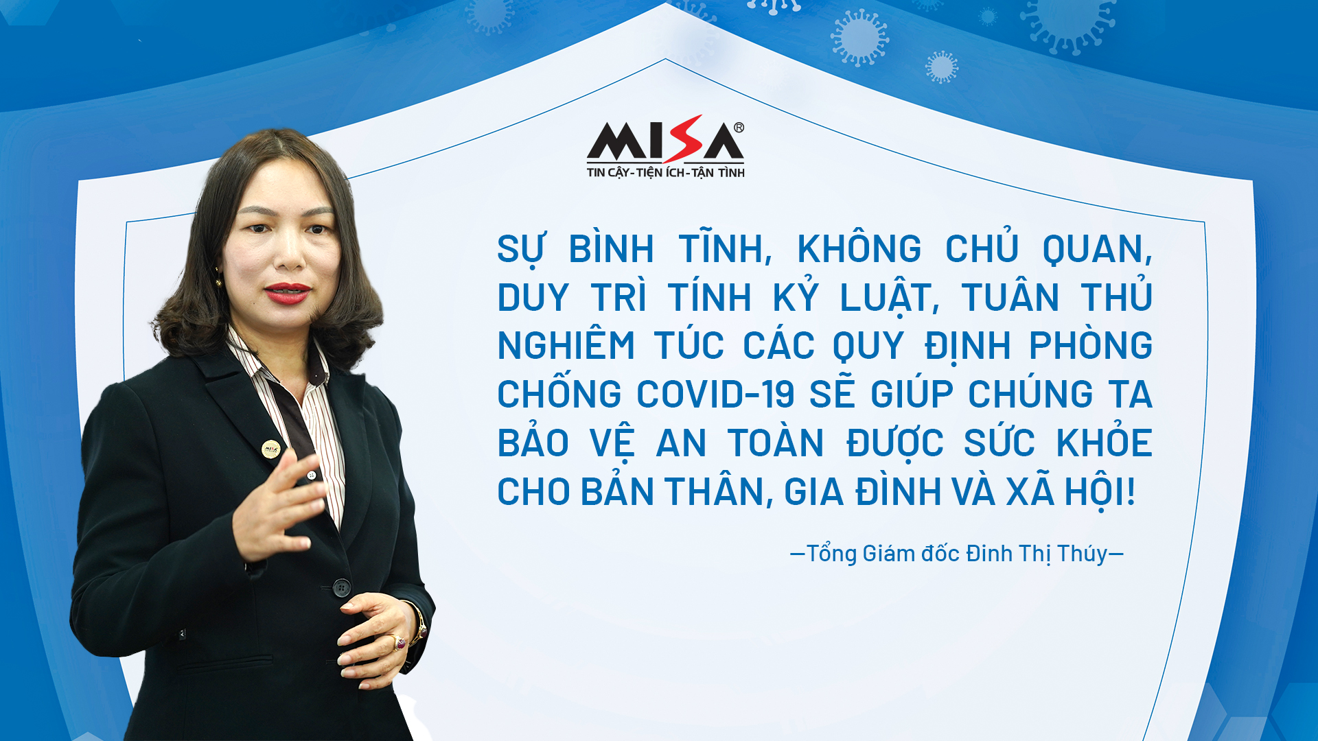 Trên đây là những chia sẻ tâm huyết của tôi muốn gửi đến các CBNV MISA khu vực phía Nam nói riêng và người MISA trên cả nước nói chung. Hãy luôn bình tĩnh, suy nghĩ lạc quan, thay đổi thích ứng nhanh với sự biến đổi của xã hội. Tôi kêu gọi các thành viên trong đại gia đình MISA hãy chủ động bảo vệ sức khỏe cho bản thân, gia đình và hãy dành thời gian tập trung cho công việc nhiều nhất có thể để gia tăng năng suất làm việc, tối ưu chi phí hoạt động.