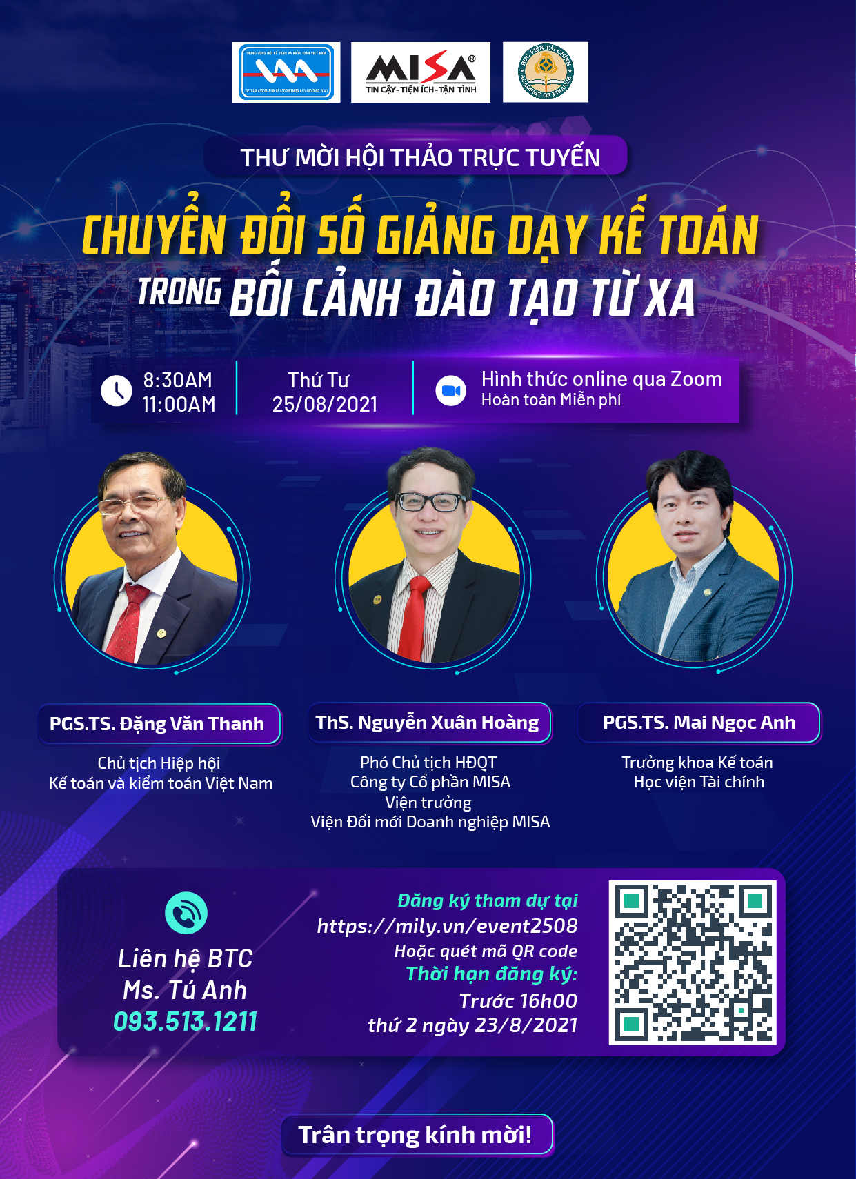 Nhằm giúp các Trường/Trung tâm/Công ty dịch vụ đào tạo chuyên ngành kế toán hiểu rõ về chương trình chuyển đổi số Quốc gia trong lĩnh vực giáo dục nói chung và trong chuyên ngành giảng dạy kế toán nói riêng cũng như giải pháp nâng cao chất lượng dạy và học bộ môn kế toán trong bối cảnh hiện nay, Công ty Cổ phần MISA phối hợp với Hiệp hội Kế toán và Kiểm toán Việt Nam, Học viện Tài chính tổ chức hội thảo trực tuyến (qua Ứng dụng Zoom) với chủ đề “Chuyển đổi số giảng dạy kế toán trong bối cảnh đào tạo từ xa”. Hội thảo sẽ diễn ra: