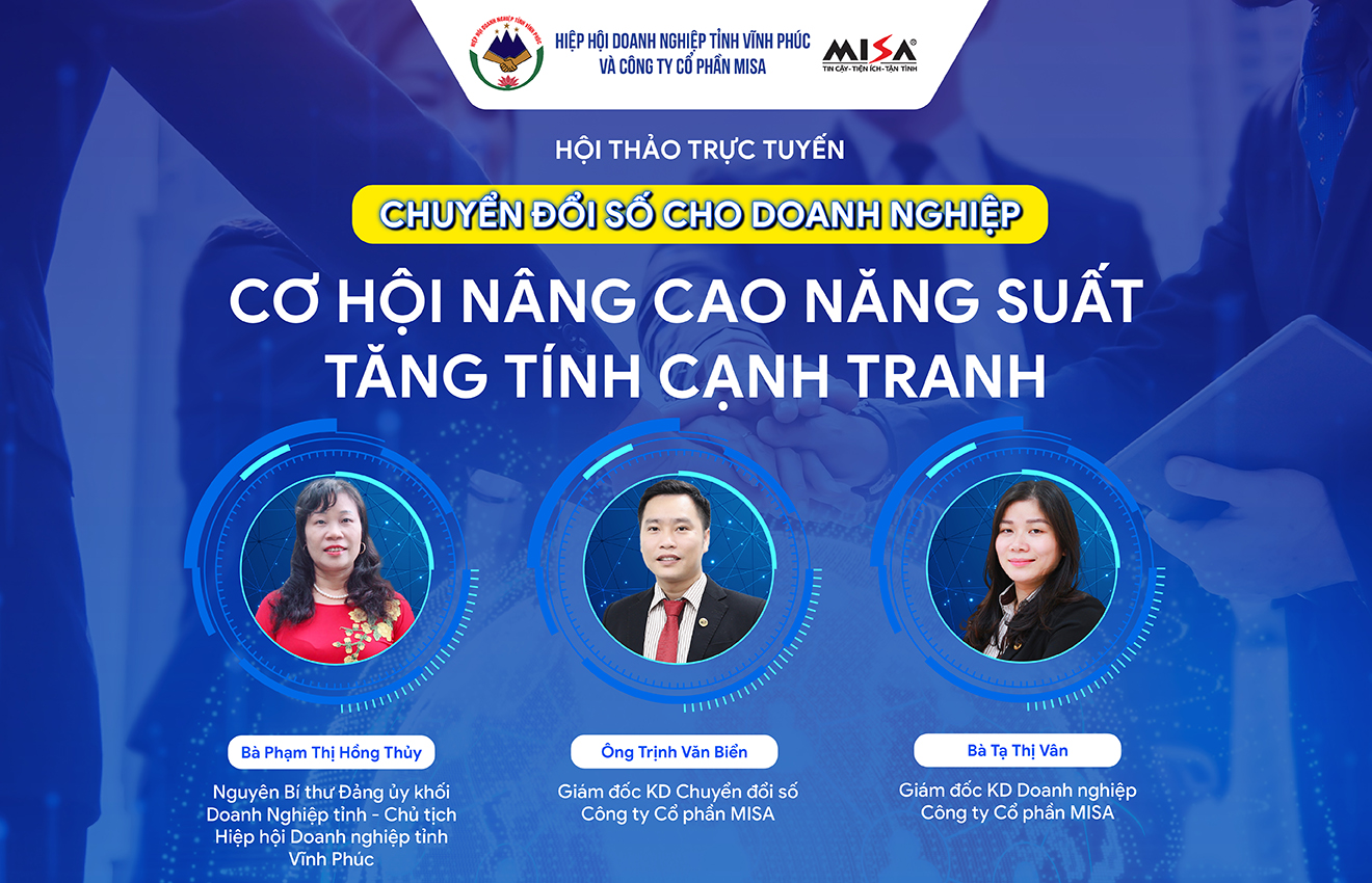 Nhằm hỗ trợ kịp thời cho các doanh nghiệp tỉnh Vĩnh Phúc nắm bắt giải pháp chuyển đổi số để duy trì hoạt động giữa giai đoạn dịch bệnh căng thẳng, Hiệp hội Doanh nghiệp tỉnh Vĩnh Phúc phối hợp cùng Công ty Cổ phần MISA tổ chức chương trình hội thảo “Chuyển đổi số doanh nghiệp cơ hội nâng cao năng suất, tăng tính cạnh tranh”.