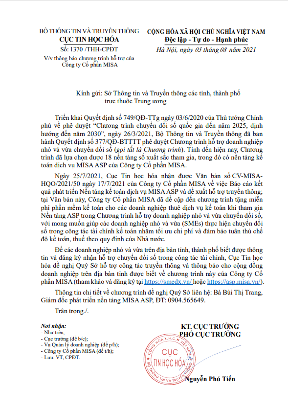 Ngày 05/08/2021, Cục Tin học hóa – Bộ Thông tin và Truyền thông đã gửi Công văn số 1370/THH-CPĐT đến các Sở Thông tin và Truyền thông trên toàn quốc về chương trình đồng hành chuyển đổi số trong công tác tài chính thông qua nền tảng MISA ASP. Đây là một trong các nền tảng Make in Vietnam xuất sắc được Bộ Thông tin và Truyền thông đánh giá lựa chọn.