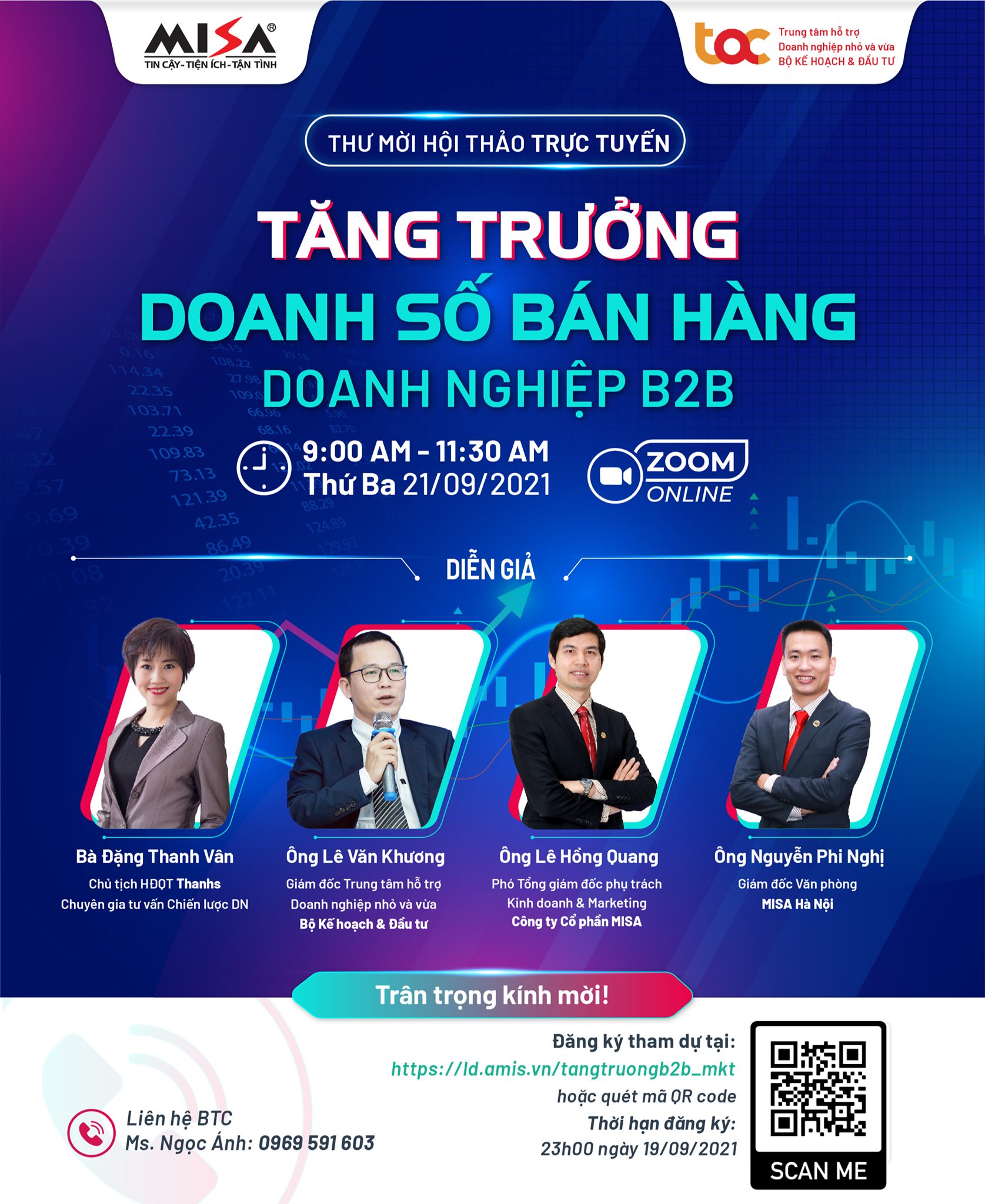 Nhằm kịp thời hỗ trợ cộng đồng doanh nghiệp B2B có chiến lược bán hàng hiệu quả, tăng trưởng doanh số trong bối cảnh làm việc từ xa, Trung tâm Hỗ trợ Doanh nghiệp vừa và nhỏ phía Bắc – Bộ Kế hoạch & Đầu tư và Công ty Cổ phần MISA tổ chức hội thảo với chủ đề “Tăng trưởng doanh số bán hàng – Doanh nghiệp B2B”. Cụ thể, hội thảo sẽ diễn ra: