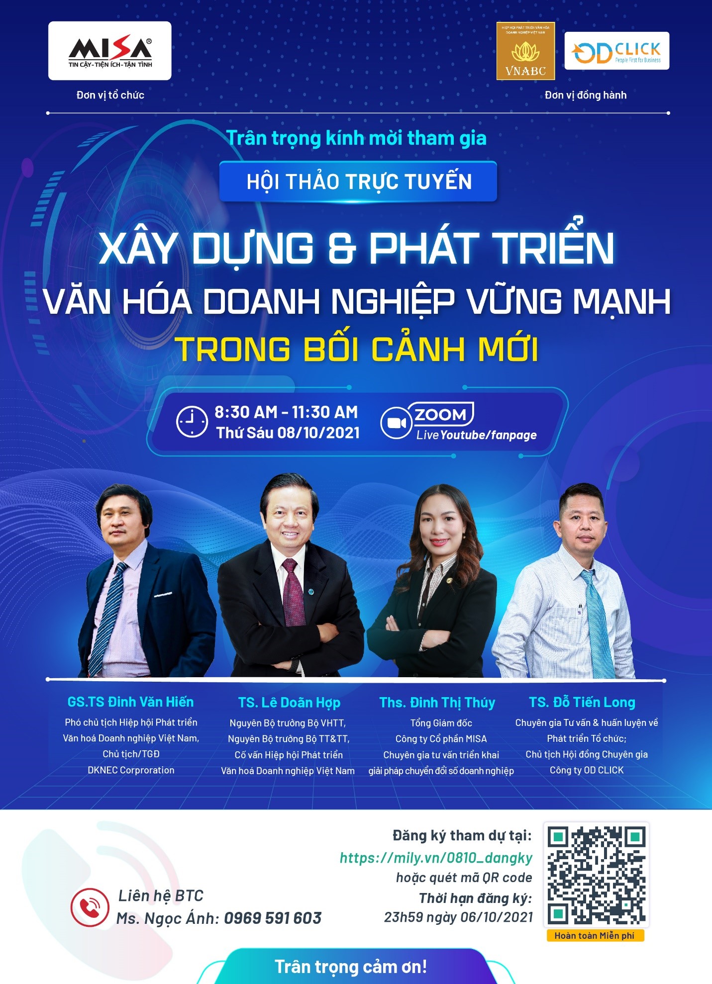 Nhằm giải đáp nỗi trăn trở của những nhà lãnh đạo doanh nghiệp về cách thức xây dựng văn hóa doanh nghiệp bền vững trong bối cảnh xu thế chuyển đổi số cũng như tăng cường kiến thức và kỹ năng quản lý, điều hành doanh nghiệp, Công ty cổ phần MISA phối hợp cùng Hiệp hội Phát triển Văn hóa Doanh nghiệp, DKNEC Corporation và Công ty TNHH Tư vấn quản lý OD Click tổ chức sự kiện “Xây dựng và phát triển văn hoá doanh nghiệp vững mạnh trong bối cảnh mới”.