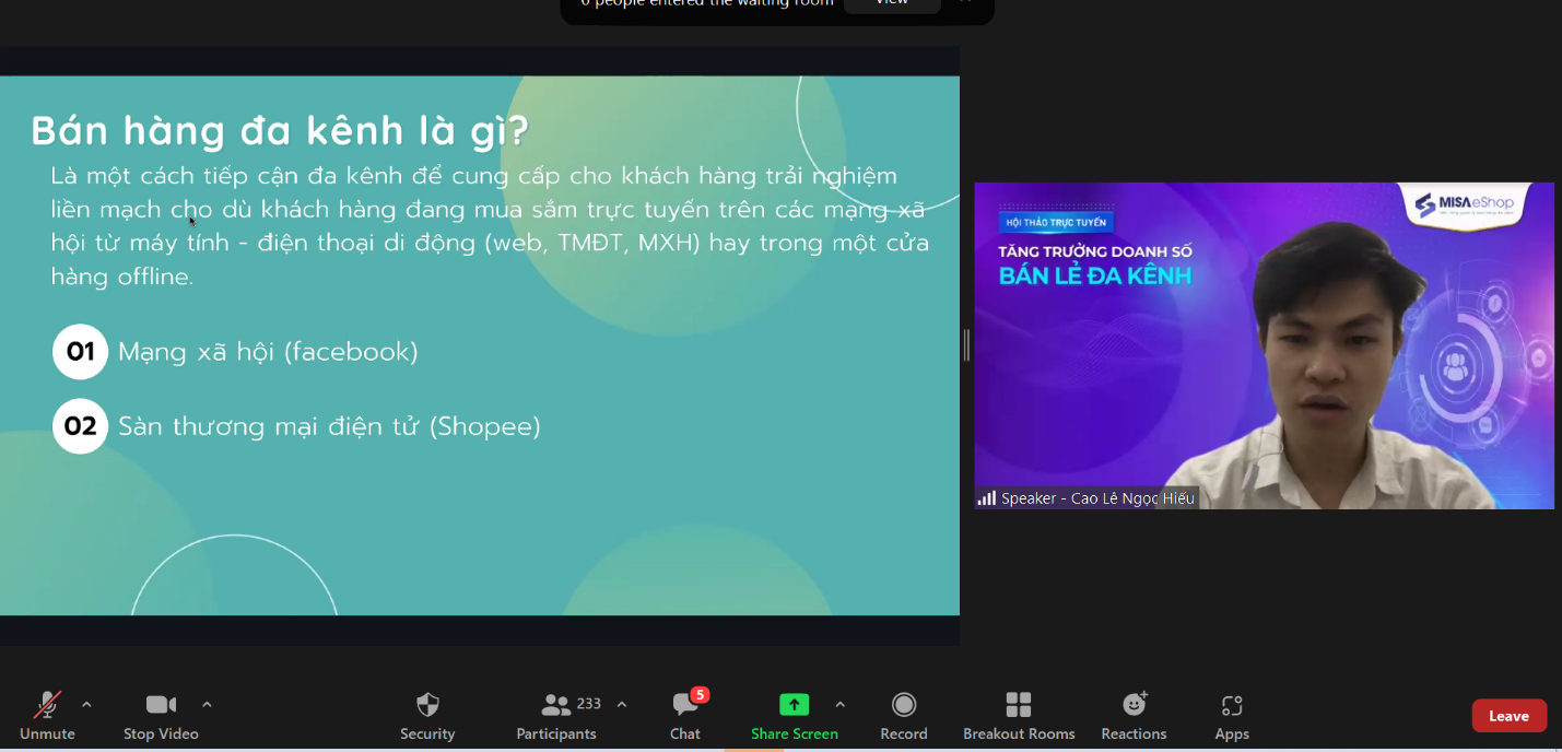 Với hơn 6 năm kinh nghiệm trong lĩnh vực bán hàng đa kênh, đặc biệt thành công trên các sàn Thương mại Điện tử (TMĐT) hàng đầu Việt Nam, diễn giả Cao Lê Ngọc Hiếu đã đem đến phần trình bày hấp dẫn và chi tiết về cách thức bán hàng trên cả mạng xã hội và các sàn TMĐT. Đưa ra những ưu điểm, nhược điểm cùng cách khắc phục khi bán hàng tại hai kênh Facebook và Shoppee, diễn giả Cao Lê Ngọc Hiếu kết luận rằng “Giải pháp bán hàng đa kênh đảm bảo cửa hàng vận hành tốt nhất có thể, giúp cắt giảm chi phí và tăng trưởng doanh thu.