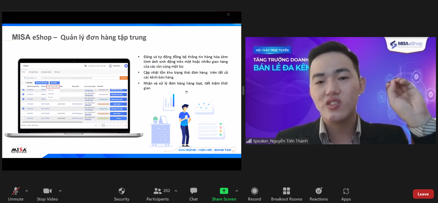 Nhằm hỗ trợ những khó khăn của chủ cửa hàng bán lẻ trước trạng thái bình thường mới sau dịch Covid-19, sáng ngày 9/10, Công ty Cổ phần MISA tổ chức hội thảo trực tuyến “Tăng trưởng doanh số bán lẻ đa kênh”. Hội thảo có sự tham gia của các diễn giả có nhiều kinh nghiệm trong bán lẻ đa kênh trực tuyền: Ông Cao Lê Ngọc Hiếu – Chuyên gia bán hàng Shopee – Training E-Com tại The Dariu Foundation Vietnam – Chuyên gia giảng dạy tại KTcity và Ông Nguyễn Tiến Thành – Trưởng phòng Kinh doanh Công ty Cổ phần MISA. Hội thảo đã thu hút đông đảo chủ các cửa hàng và doanh nghiệp bán lẻ trên toàn quốc.