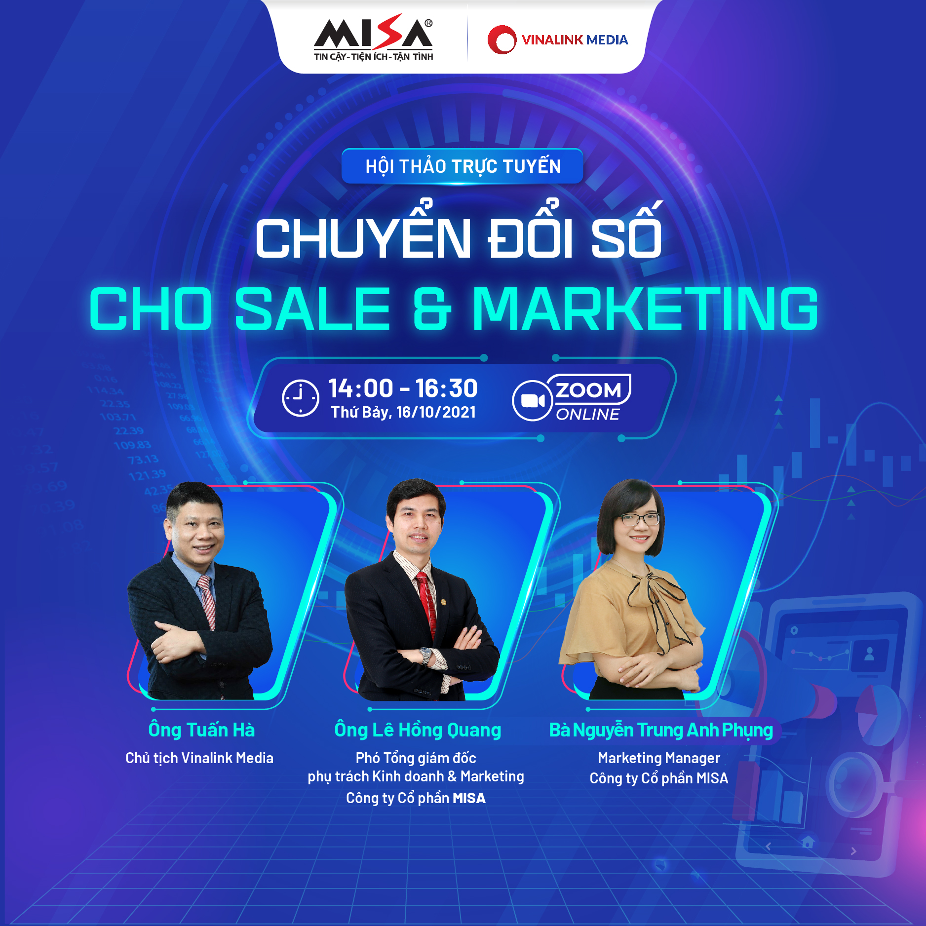 Ba vấn đề lớn mà các lãnh đạo, quản lý Sales & Marketing quan tâm trong giai đoạn “bình thường mới” này đó là: Doanh nghiệp nên áp dụng chiến lược Marketing nào trong giai đoạn này; Làm thế nào để thu hút và chuyển đổi khách hàng tiềm năng hiệu quả hơn; Làm thế nào để tổ chức bán hàng hiệu quả và tăng trưởng doanh số. Để giải bài toán đó cho doanh nghiệp, MISA phối hợp với Vinalink tổ chức Hội thảo trực tuyến chia sẻ kinh nghiệm “Chuyển đổi số cho Sales và Marketing” vào 14:00 – 16:30, Thứ 7, ngày 16/10/2021 thông qua ứng dụng Zoom.