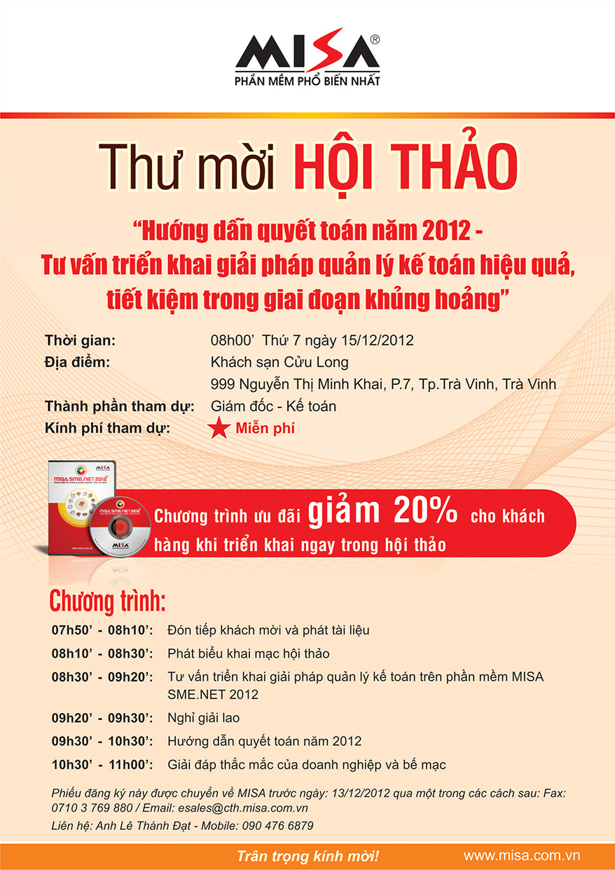 Ngày 15/12/2012, tại tỉnh Trà Vinh sẽ diễn ra hội thảo “Hướng dẫn quyết toán năm 2012 – Tư vấn triển khai giải pháp quản lý kế toán hiệu quả, tiết kiệm trong giai đoạn khủng hoảng ”. Đây là một trong những chương trình của MISA nhằm hỗ trợ các doanh nghiệp trên địa bàn tỉnh hiểu rõ cách quyết toán năm 2012 và các giải pháp nhằm đem lại hiệu quả cho Doanh nghiệp thời khủng hoảng.
