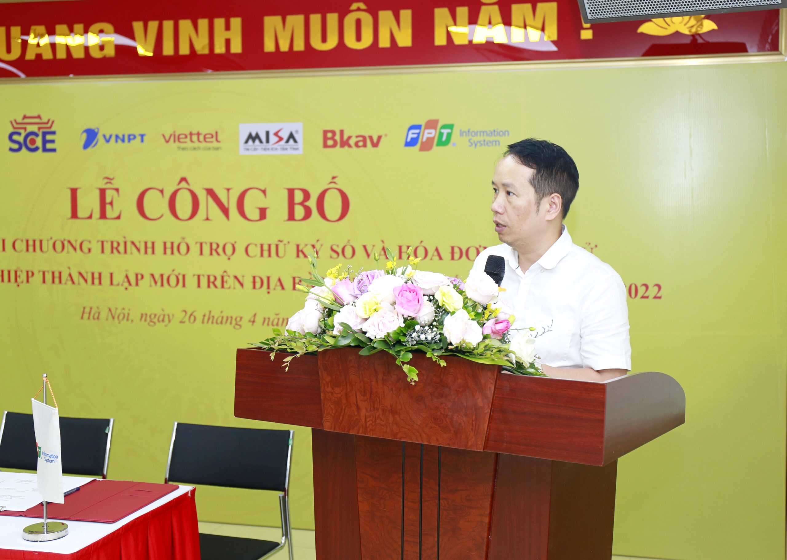 Mở đầu chương trình, ông Ngô Minh Toàn – Giám Đốc Trung tâm hỗ trợ doanh nghiệp Hà Nội đã có phần trình bày báo cáo tình hình triển khai tình hình thực hiện gói Hỗ trợ trong năm 2021. Theo đó, ông Ngô Minh Toàn cho biết chương trình hỗ trợ 01 (một) năm chữ ký số và 500 hóa đơn điện tử cho các doanh nghiệp thành lập mới trên địa bàn Hà Nội đã dành được sự đón nhận và là một tiền đề thuận lợi cho các doanh nghiệp trong những ngày đầu khởi sự, đặc biệt trong giai đoạn toàn xã hội bị ảnh hưởng bởi làn sóng covid năm vừa qua.