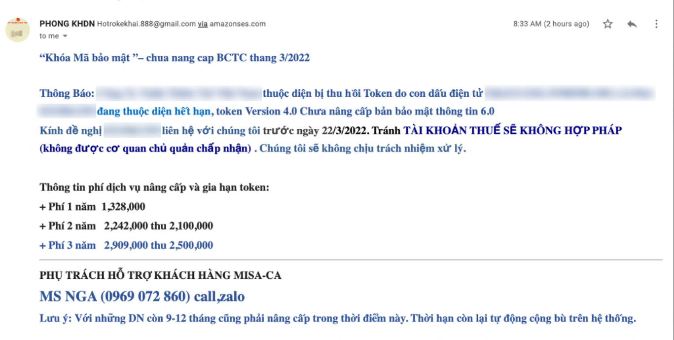 Thời gian gần đây, nhiều Quý khách hàng sử dụng sản phẩm Chữ ký số MISA eSign nhận được các email tự xưng là Phụ trách hỗ trợ khách hàng MISA-CA, Phòng khách hàng Doanh nghiệp MISA-CA… và gửi các thông tin sai lệch như: cần thu hồi USB Token do con dấu điện tử hết hạn; USB Token chưa nâng cấp bảo mật thông tin; USB Token chưa nâng cấp hết hạn kê khai;… Tất cả những thông tin này gây hoang mang và thiệt hại kinh tế cho Quý khách hàng.