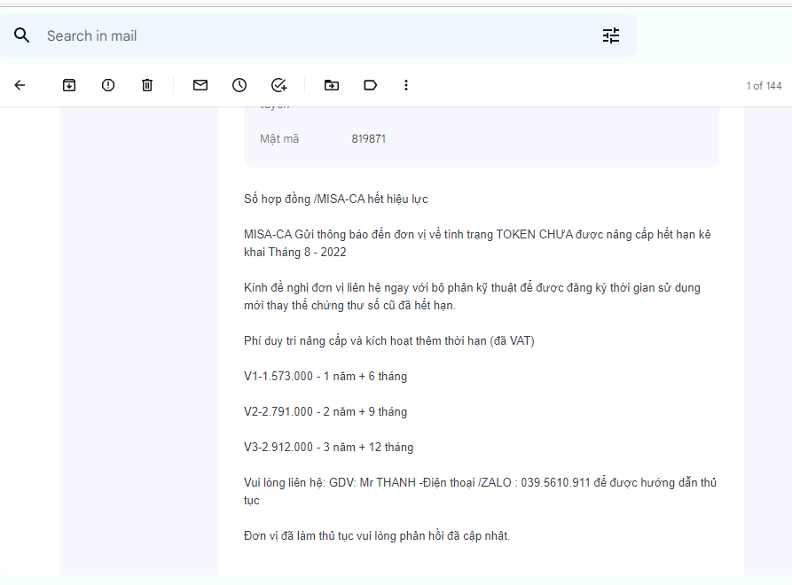 | 1 | Ms Linh | [email protected] | 098.991.7100 | Thông báo tình trạng TOKEN chưa được nâng cấp, hết hạn kê khai |