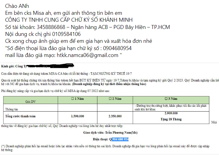 | 7 | Mr Hoàng | [email protected] | 09369.19.230 | Giả mạo là MISA thông báo gia hạn chữ ký số |
