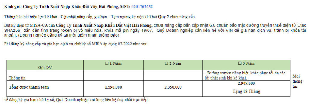 | 4 | Ms. Phương Hoa | [email protected] | 0904680954 | Thông báo tình trạng Token bị vô hiệu hóa do chưa nâng cấp bản cập nhật 6.0 chuẩn bảo mật đường truyền thuế điện tử Etax SHA256 |