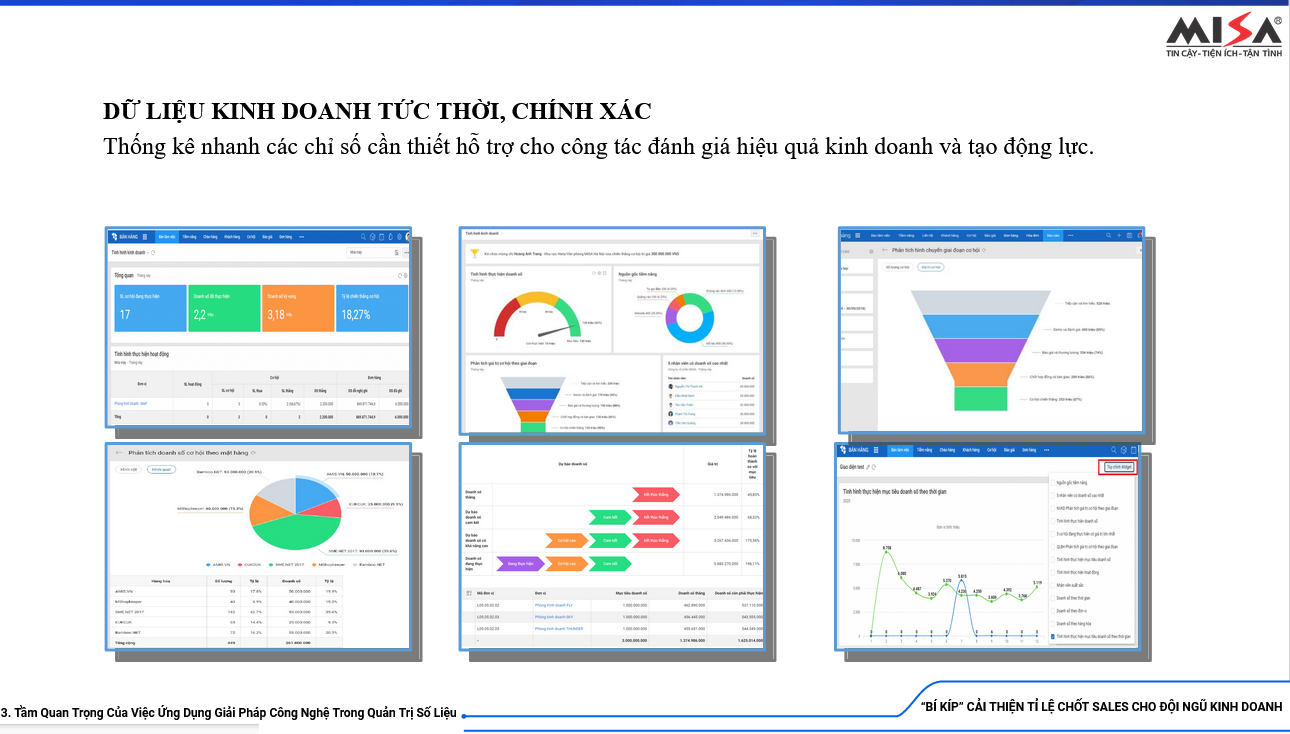 Cụ thể, hệ thống AMIS CRM còn giúp tối ưu toàn diện quy trình bán hàng, tăng khả năng chốt sale được thể hiện thông qua khả năng đưa ra dữ liệu phân tích nâng cao nhằm cải thiện tỷ lệ rời bỏ của khách hàng; tập trung vào nhóm khách hàng tiềm năng và loại bỏ sự lãng phí vào những người có ít khả năng mua. Đặc biệt, với việc đưa ra phân tích các chỉ số, báo cáo trực quan, phần mềm AMIS CRM giúp cải thiện 87% doanh số bán hàng một cách hiệu quả.