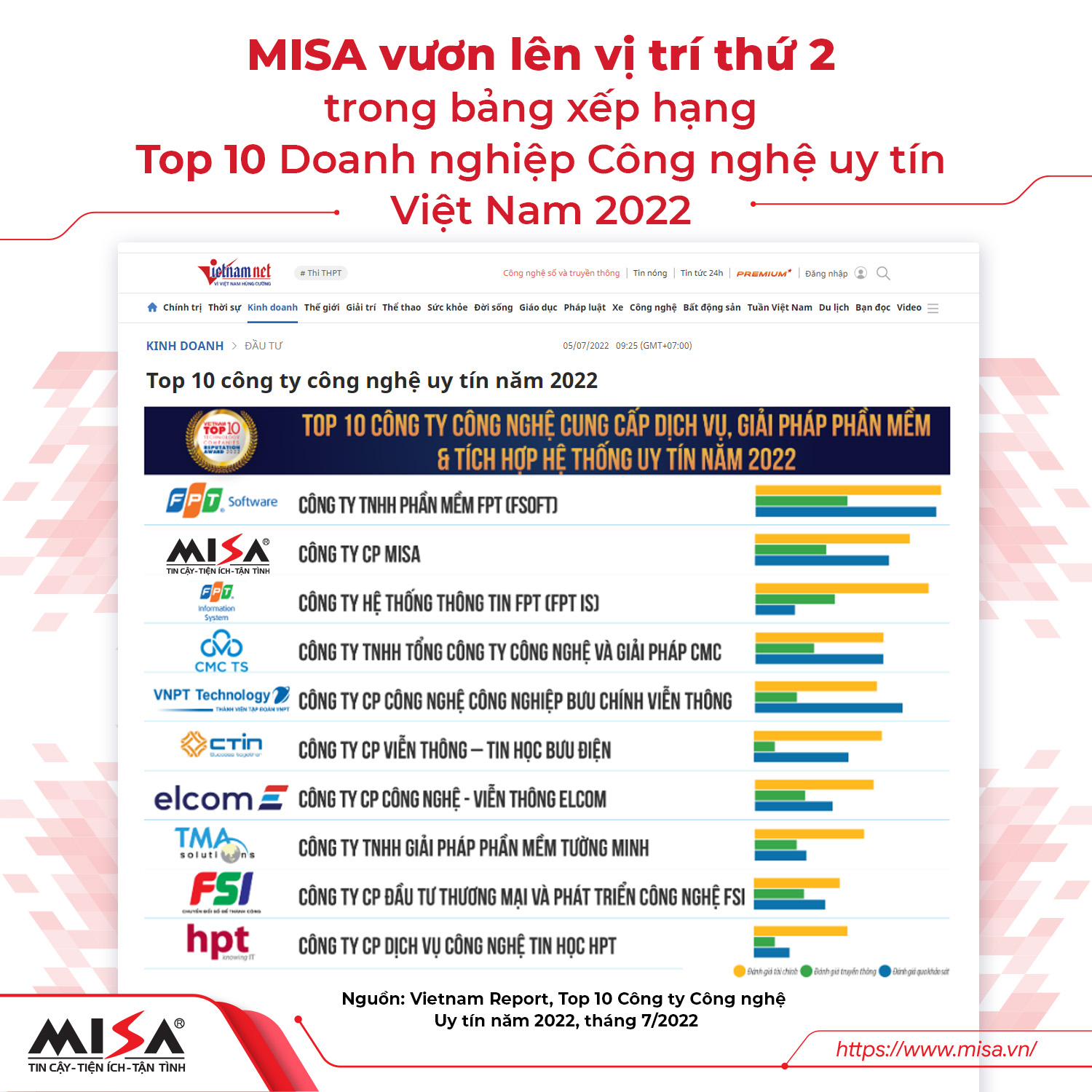 Ngày 5/7/2022, Vietnam Report chính thức công bố danh sách Top 10 Công ty Công nghệ cung cấp Dịch vụ, Giải pháp phần mềm & Tích hợp hệ thống uy tín năm 2022. Trong danh mục này, MISA vươn lên xếp vị trí thứ 2 và khẳng định được vị thế cũng như dấu ấn của mình trong ngành Công nghệ thông tin (CNTT) Việt Nam.