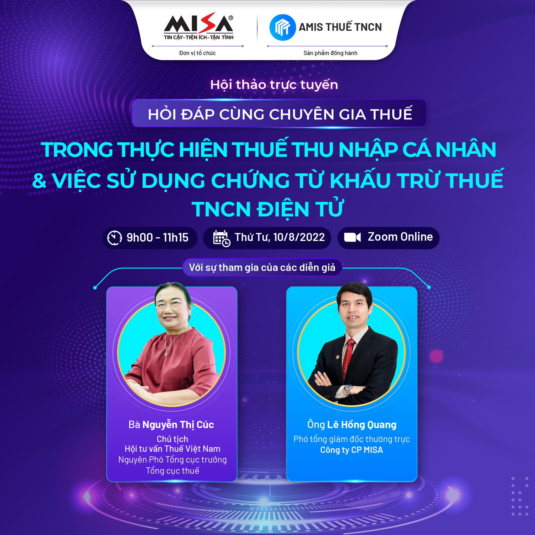 Hiểu được bài toán đó, Công ty Cổ phần MISA tổ chức hội thảo với chủ đề “Hỏi đáp cùng chuyên gia thuế trong thực hiện thuế thu nhập cá nhân và việc sử dụng chứng từ khấu trừ thuế TNCN điện tử” hoàn toàn miễn phí dành cho CEO/chủ doanh nghiệp và kế toán viên. Hội thảo được tổ chức cụ thể:
