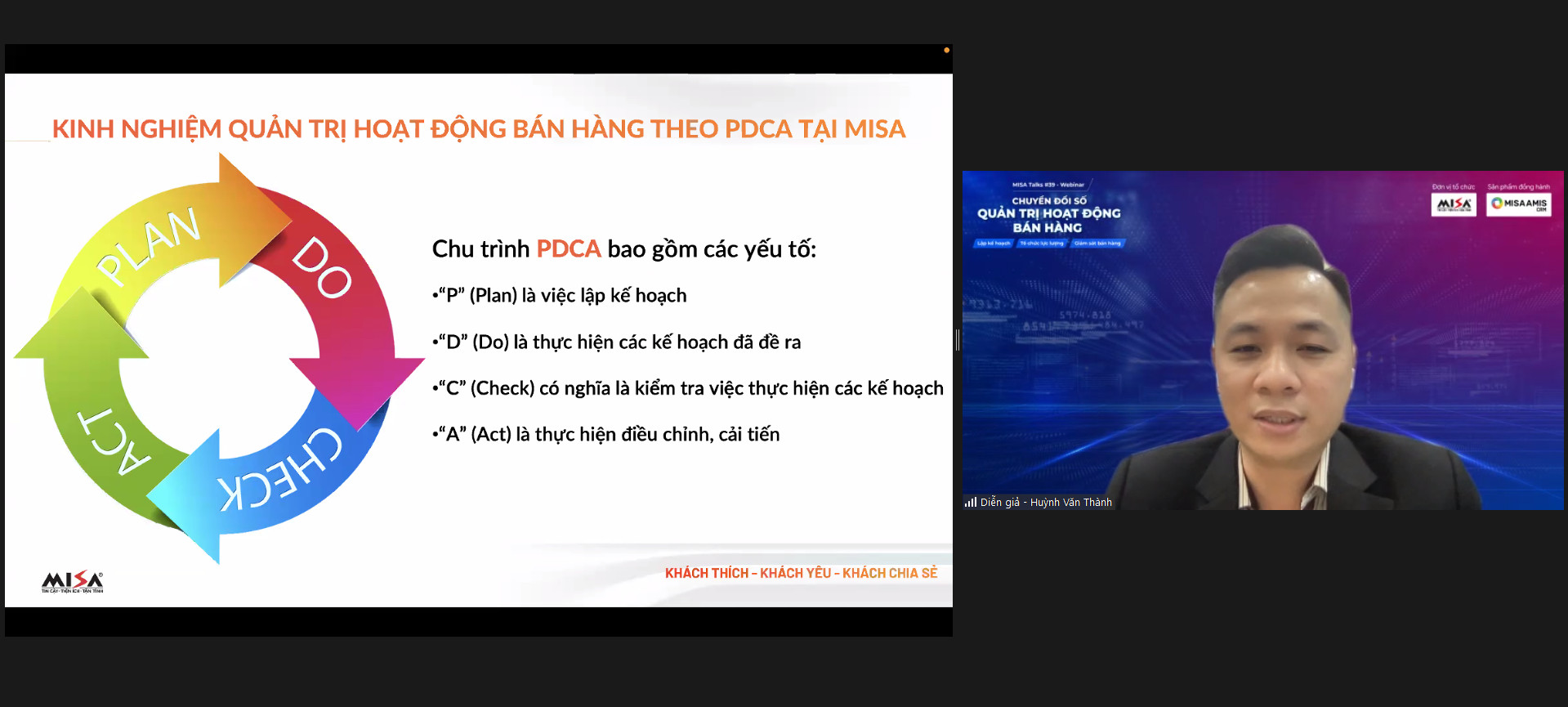 Với kinh nghiệm hơn 10 năm tư vấn triển khai ứng dụng công nghệ trong bán hàng cho hàng ngàn doanh nghiệp từ nhỏ đến lớn, ông Thành chia sẻ phương pháp quản trị bán hàng hiệu quả: “Theo kinh nghiệm quản lý kinh doanh của tôi tại MISA, hiện nay việc quản trị hoạt động bán hàng đang được thực hiện theo chu trình PDCA bao gồm các yếu tố: “P” (Plan) là việc lập kế hoạch; “D” (Do) là thực hiện các kế hoạch đã đề ra; “C” (Check) có nghĩa là kiểm tra việc thực hiện các kế hoạch và “A” (Act) là thực hiện điều chỉnh, cải tiến”, ông Thành phân tích.