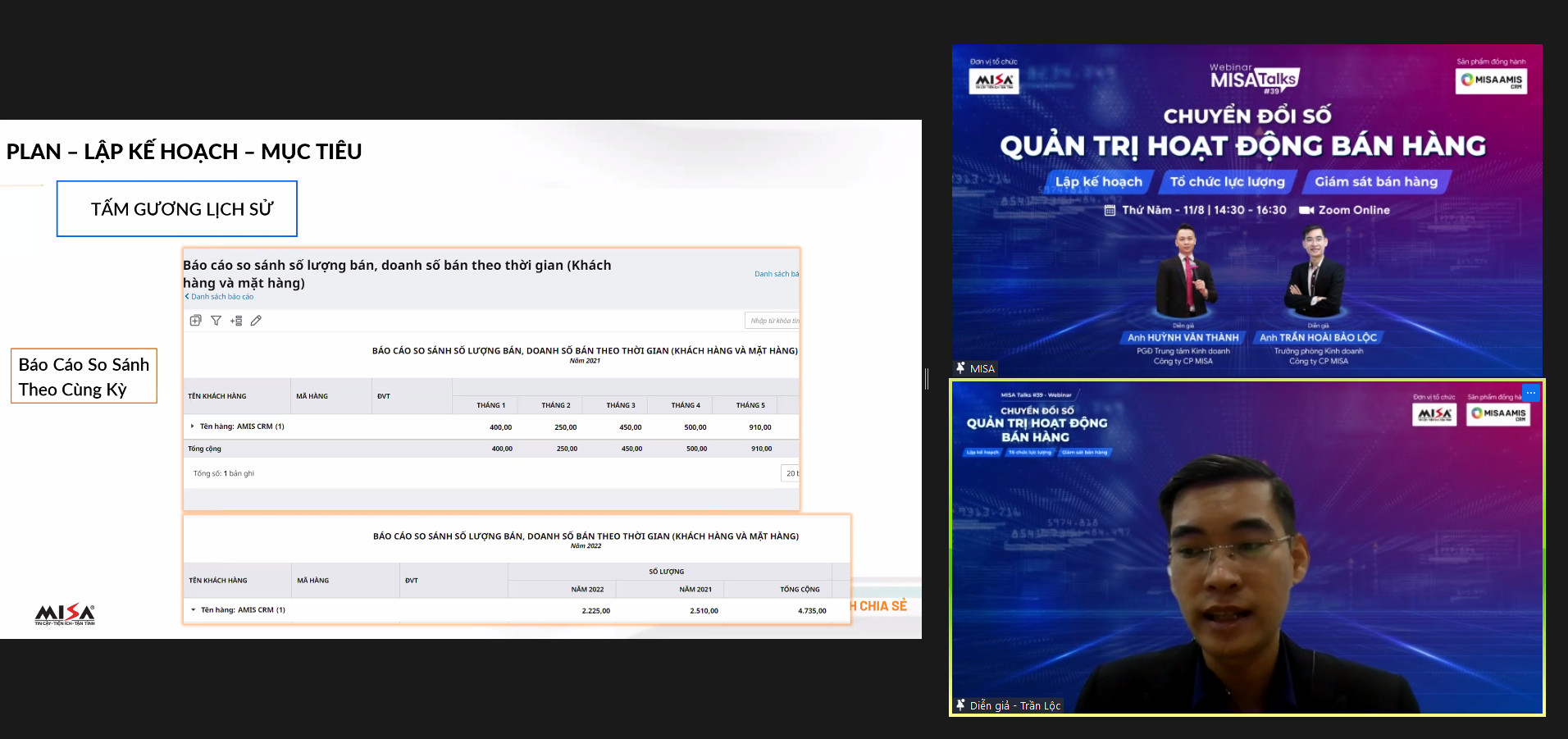 Chiều 11/8/2022, Công ty Cổ phần MISA đã tổ chức hội thảo trực tuyến với chủ đề “Chuyển đổi số quản trị hoạt động bán hàng” nhằm hỗ trợ các doanh nghiệp ứng dụng công nghệ quản trị bán hàng để tối đa hóa lợi nhuận và nâng cao lợi thế cạnh tranh trên thị trường. Hội thảo có sự tham dự của ông Huỳnh Văn Thành – Phó Giám Đốc Trung tâm kinh doanh Công ty Cổ phần MISA và ông Trần Hoài Bảo Lộc – Trưởng phòng kinh doanh Công ty Cổ phần MISA.