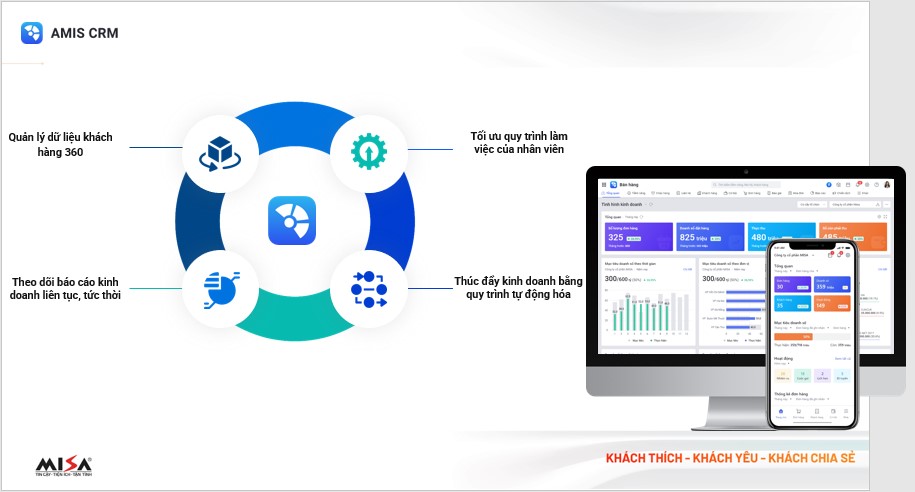 Phần mềm MISA AMIS CRM cũng dễ dàng, thuận tiện trong việc liên kết với các giải pháp bên ngoài như giải pháp giao dịch điện tử, giao vận, kế toán,… và kết nối chặt chẽ các bộ phận bên trong doanh nghiệp tạo thành mô hình kinh doanh hoàn chỉnh. Đặc biệt, AMIS Bán hàng cập nhật báo cáo trực quan tức thời dựa trên phân tích thực tế từ số liệu bán hàng, tìm ra “điểm nóng” giúp lãnh đạo doanh nghiệp có thể đưa ra quyết định kịp thời, đặc biệt trong bối cảnh mới với nhiều cơ hội và thách thức.