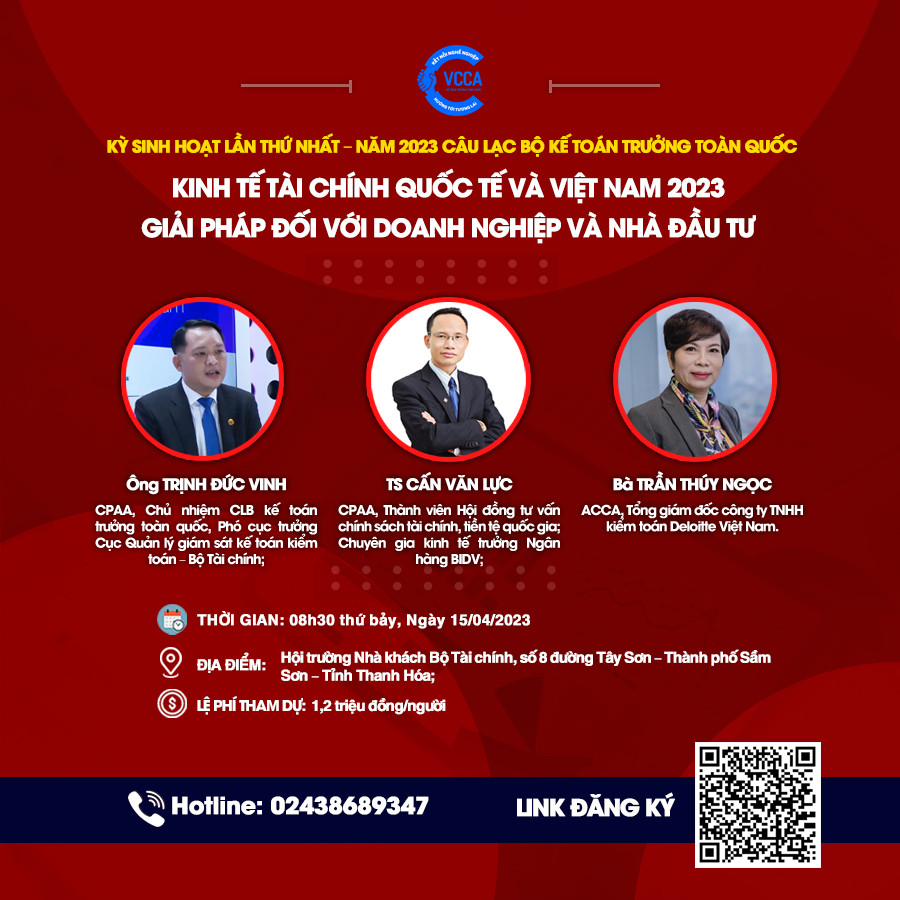 Với tư cách là DIỄN ĐÀN của kế toán trưởng toàn quốc, với mong muốn mang đến cho hội viên các thông tin hữu ích phục vụ nghề nghiệp, Câu lạc bộ Kế toán trưởng toàn quốc (VCCA) thuộc Hiệp hội Kế toán và Kiểm toán Việt Nam (VAA) tổ chức kỳ sinh hoạt lần thứ nhất – năm 2023 với chủ đề “KINH TẾ TÀI CHÍNH QUỐC TẾ VÀ VIỆT NAM 2023 – GIẢI PHÁP ĐỐI VỚI DOANH NGHIỆP VÀ NHÀ ĐẦU TƯ”, các thông tin về kỳ sinh hoạt cụ thể như sau: