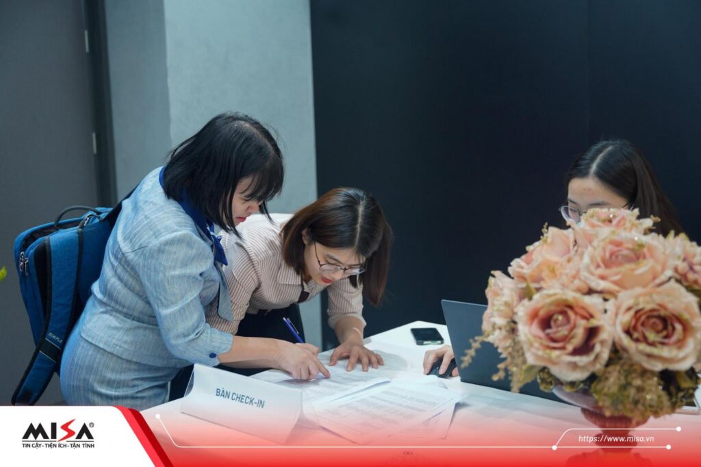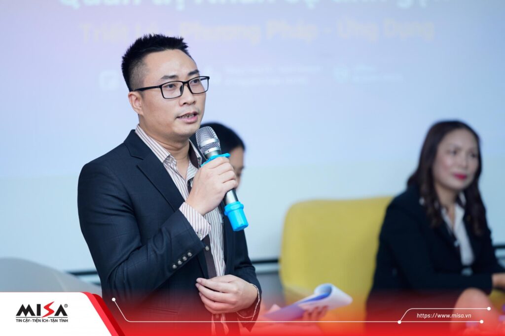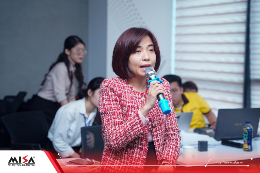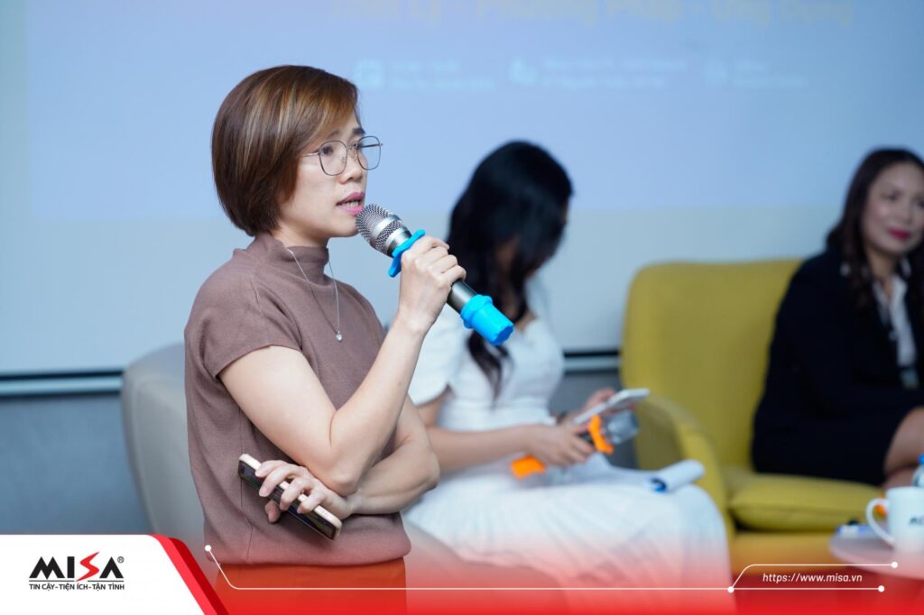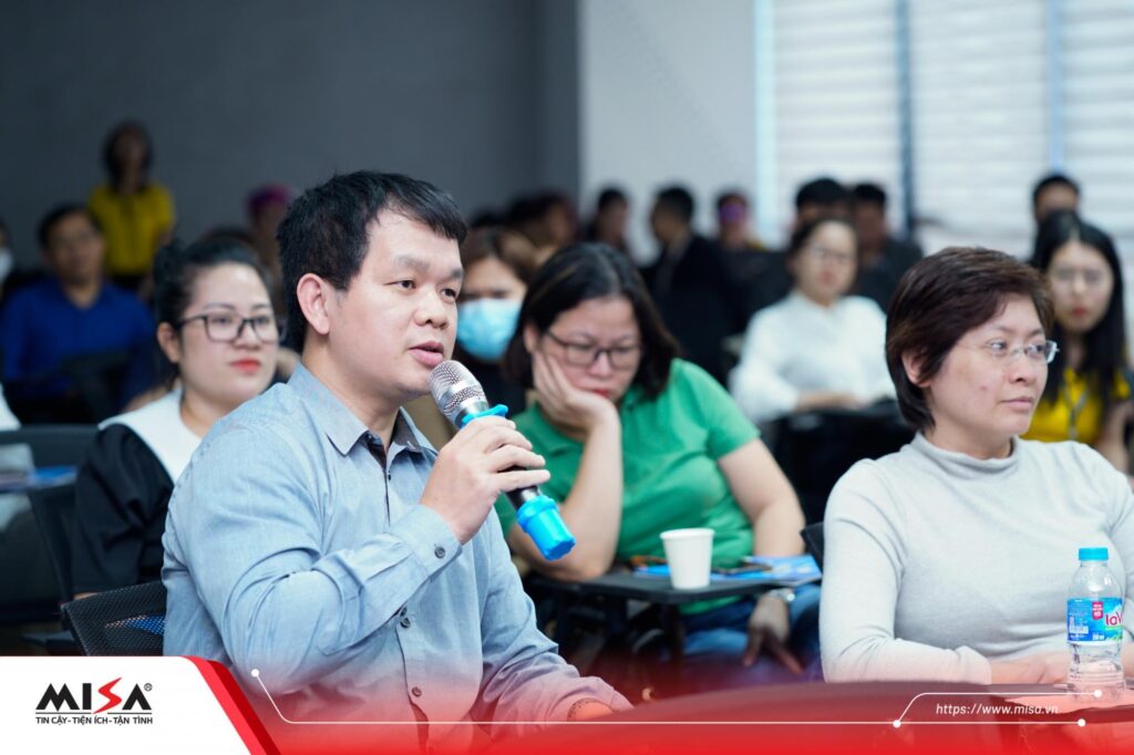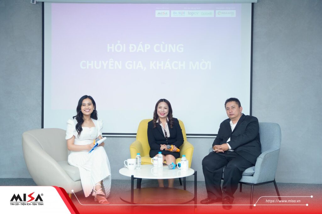 Bên cạnh phần chia sẻ của các diễn giả, các doanh nghiệp tham dự đã có cơ hội đặt câu hỏi và trao đổi về những vấn đề vướng mắc trong hoạt động quản trị nguồn nhân lực. Mỗi câu hỏi đều được Tổng Giám đốc MISA Đinh Thị Thúy và Phó Tổng Giám đốc Dr.SME Vũ Tuấn Anh giải đáp và làm sáng rõ, giúp các doanh nghiệp hiểu sâu sát về phương pháp Learn trong HR và có kế hoạch để áp dụng vào đơn vị.