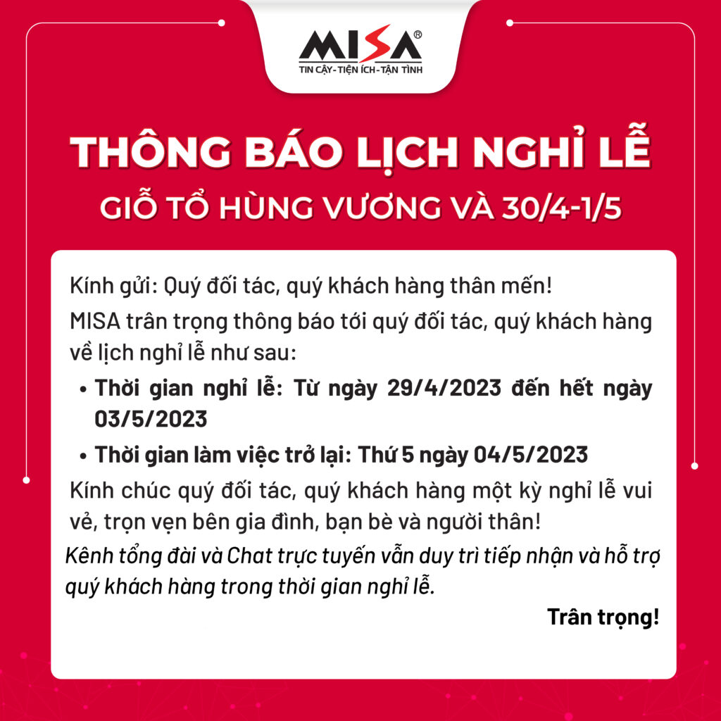 Công ty Cổ phần MISA trân trọng thông báo tới Quý khách hàng, đối tác về lịch kỳ nghỉ lễ Giỗ tổ Hùng Vương và 30/4-1/5. Thời gian nghỉ từ ngày 29/04/2023 đến hết ngày 03/05/2023.