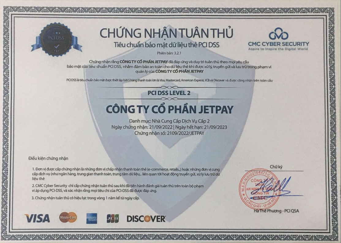 Không ngừng đổi mới để mang đến giải pháp tốt nhất cho khách hàng, giúp khách hàng xử lý mọi khó khăn trong thanh toán – MISA tự hào khi JETPAY là 1 trong 40 đơn vị đầu tiên tại Việt Nam được Ngân hàng nhà nước cấp phép hoạt động cung ứng dịch vụ trung gian thanh toán. JETPAY vinh dự đón nhận Chứng chỉ tiêu chuẩn bảo mật dữ liệu thẻ Quốc tế PCI DSS 2021.