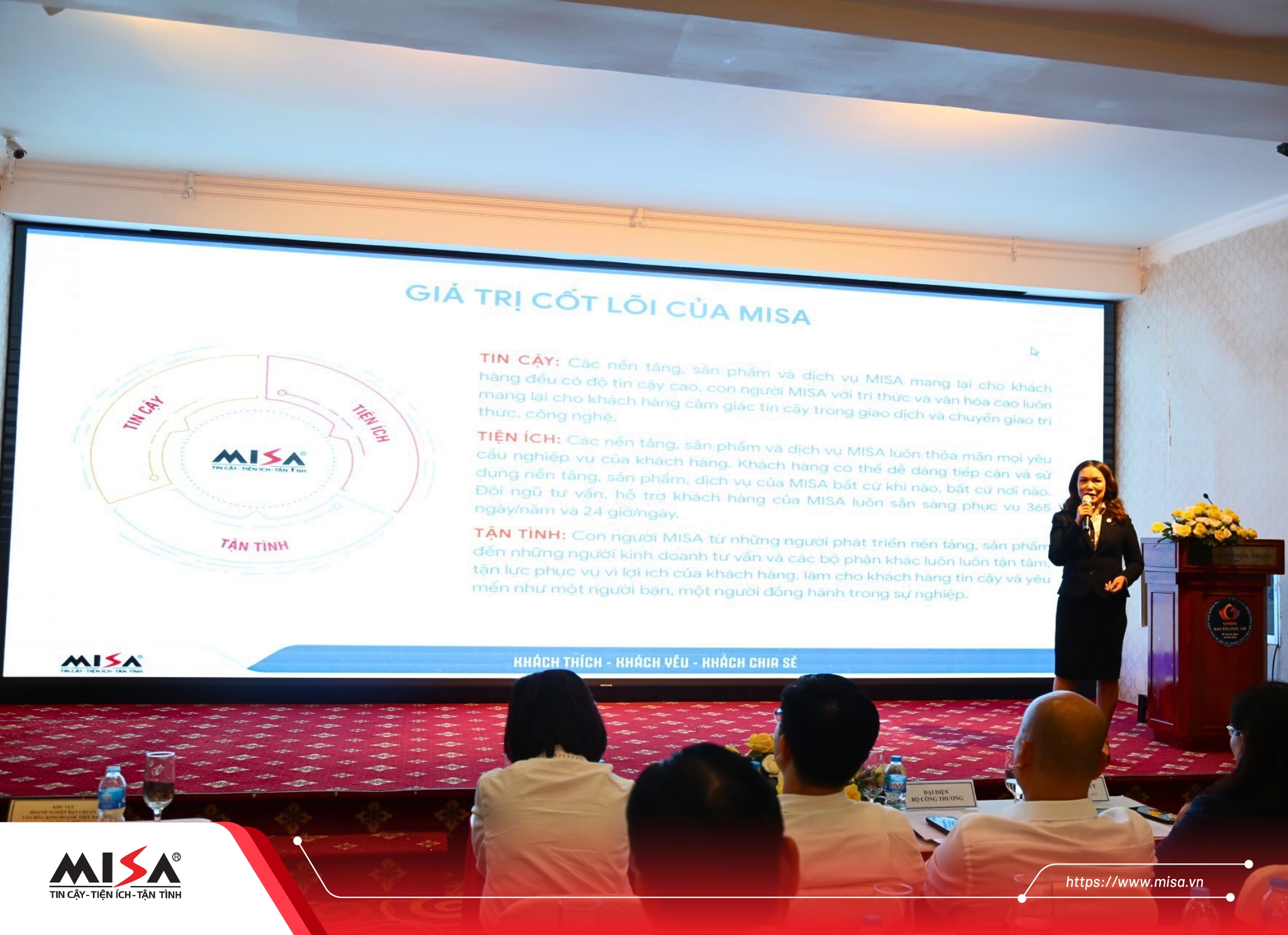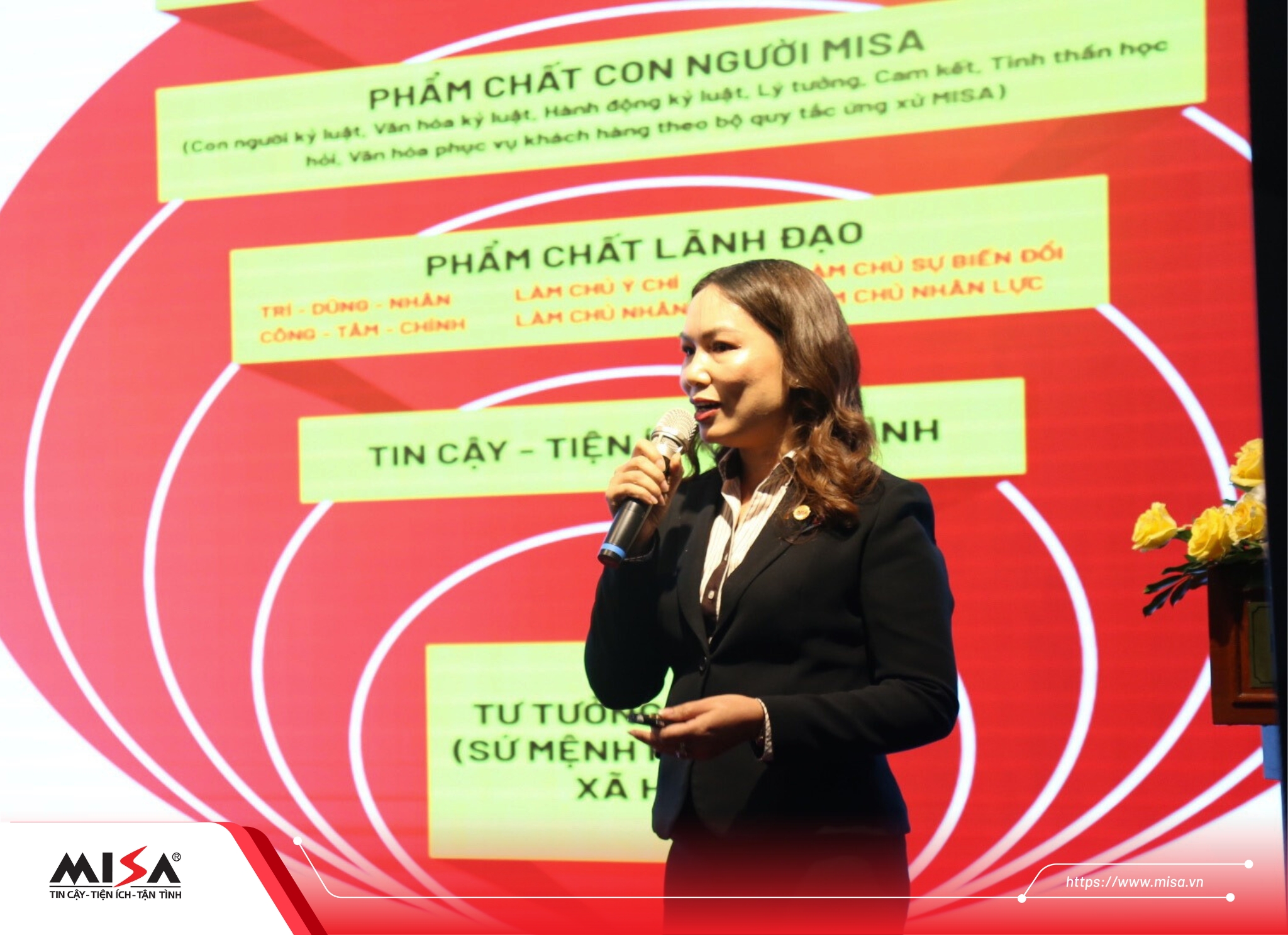 Tham dự hội nghị với vai trò là lãnh đạo Doanh nghiệp đạt chuẩn văn hóa kinh doanh Việt Nam, Tổng Giám đốc MISA Đinh Thị Thúy đã có những chia sẻ về kinh nghiệm thực tiễn xây dựng và phát triển văn hóa doanh nghiệp của MISA trong suốt hành trình gần 30 năm qua với tư tưởng cốt lõi là sứ mệnh phụng sự xã hội. Theo Tổng giám đốc, có 4 yếu tố quan trọng để xây dựng và phát triển doanh nghiệp bền vững. Đầu tiên phần lõi chính là định hướng chiến lược: luôn sáng tạo, đi trước thời đại. Bên cạnh đó, công tác điều hành phải hướng đến 3 yếu tố quan trọng là con người, quy trình và công nghệ. Nếu định hướng chiến lược là nền móng thì con người là yếu tố trung tâm, và với MISA con người phù hợp là tài sản quan trọng nhất.
