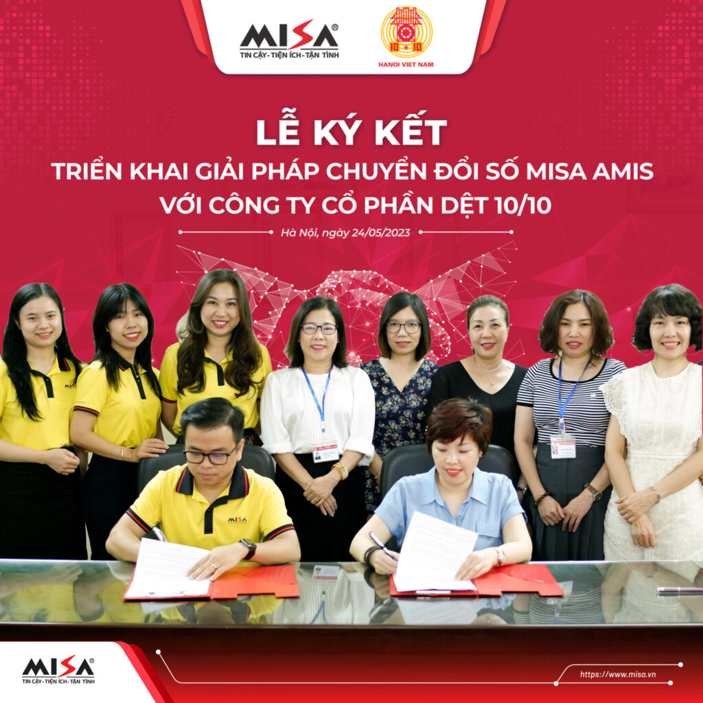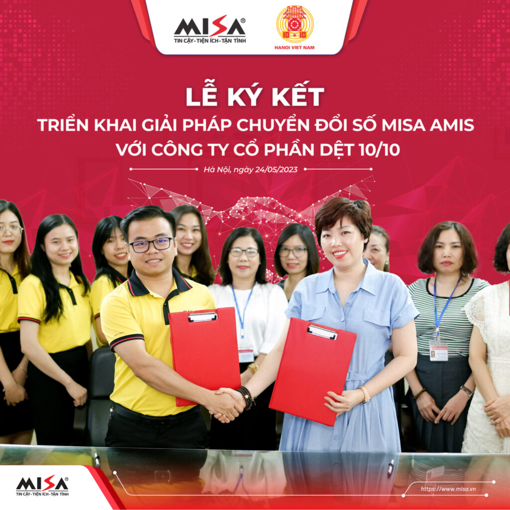 Ngày 17/05/2023, Công ty Cổ phần MISA và Công ty Cổ phần Dệt 10/10 đã chính thức ký kết hợp tác triển khai giải pháp Nền tảng quản trị doanh nghiệp hợp nhất MISA AMIS. Sự kiện là cột mốc quan trọng, đánh dấu thành công bước đầu của đội ngũ MISA trong việc tư vấn và đồng hành cùng Dệt 10/10 tháo gỡ những khó khăn trên hành trình chuyển đổi số.