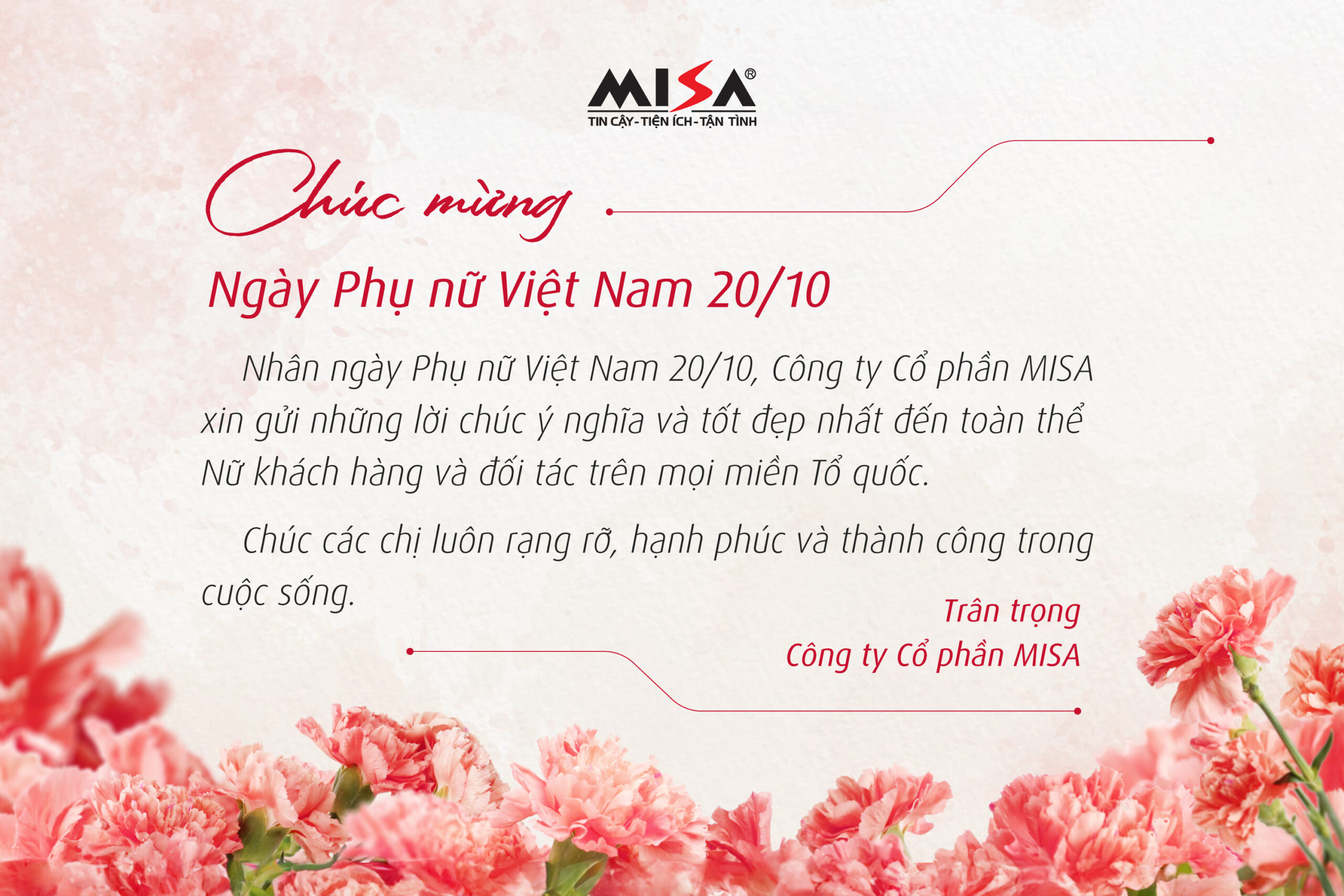 Nhân ngày Phụ nữ Việt Nam 20/10, Công ty Cổ phần MISA xin gửi những lời chúc ý nghĩa và tốt đẹp nhất đến toàn thể Nữ khách hàng và đối tác trên mọi miền Tổ quốc.