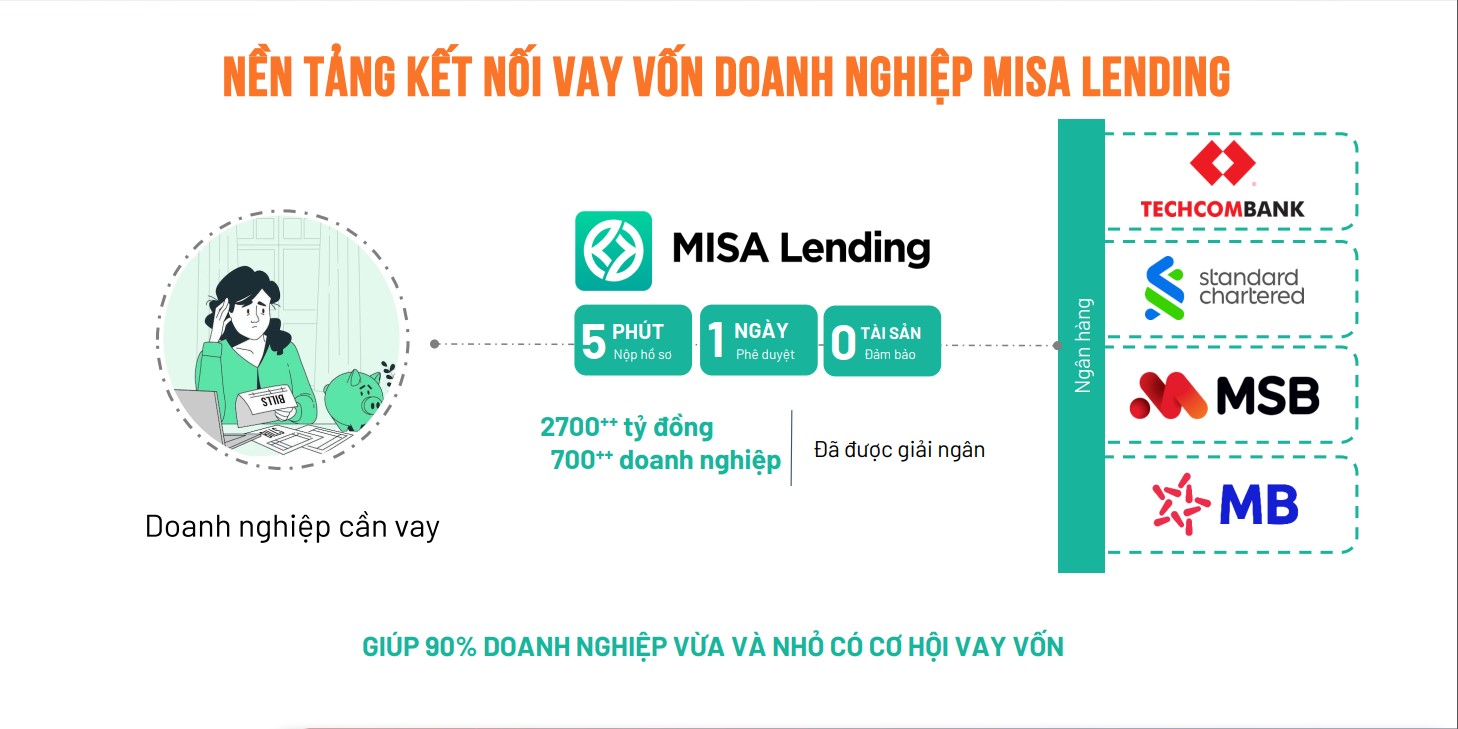 Tính đến nay, MISA Lending đã liên kết thành công với các đối tác ngân hàng lớn như Techcombank, MSB, Standard Chartered và hỗ trợ giải ngân hơn 1.500 tỷ đồng cho khách hàng doanh nghiệp. Mục tiêu trong năm 2023, MISA sẽ kết nối giải ngân 10.000 tỷ đồng vốn vay cho các doanh nghiệp có nhu cầu.