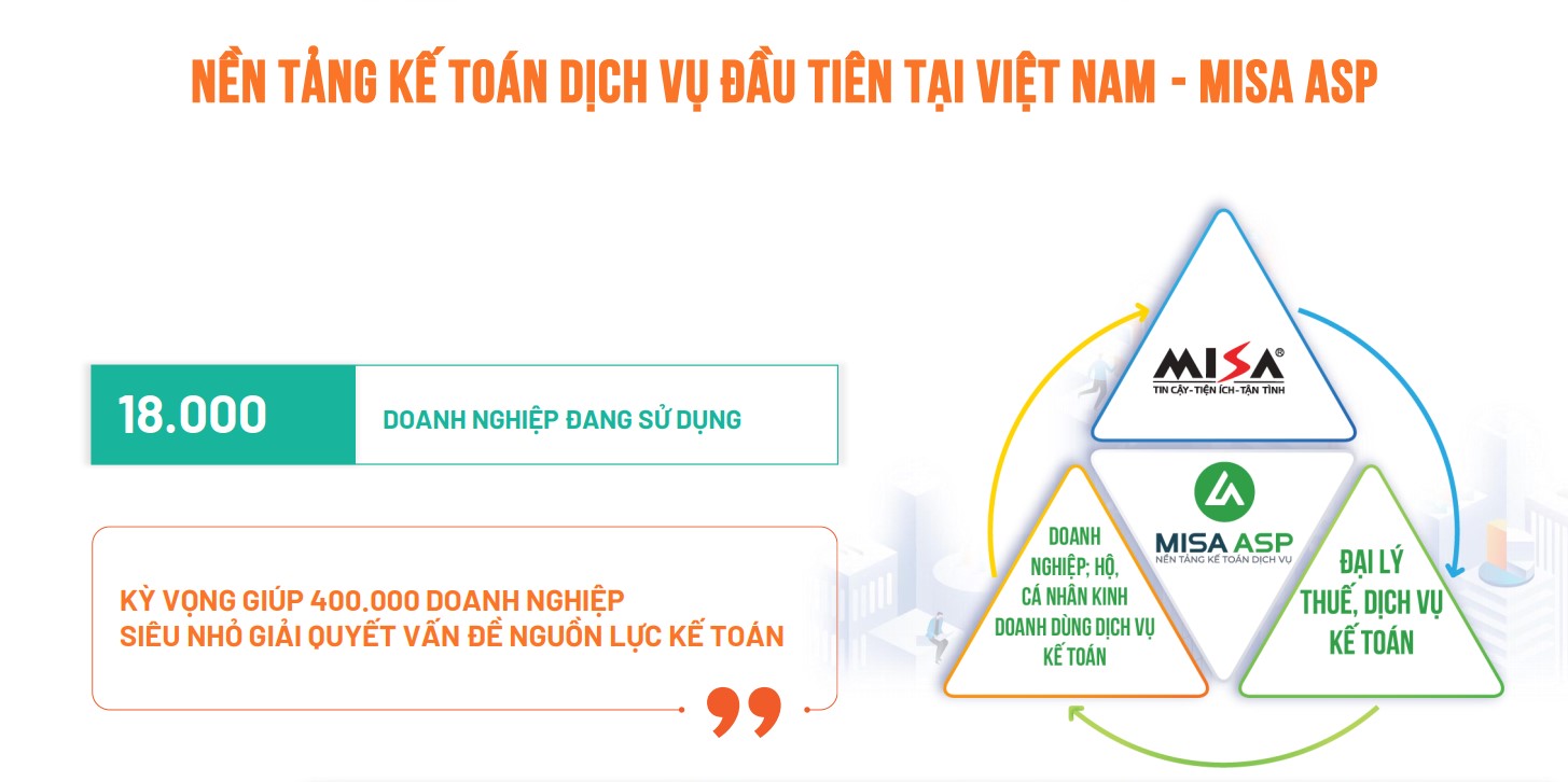 Bên cạnh vấn đề quản trị doanh nghiệp, MISA còn hỗ trợ doanh nghiệp nhỏ, siêu nhỏ chuyển đổi số, tối ưu chi phí với nền tảng kế toán dịch vụ MISA ASP. Đây là kết nối các đơn vị cung cấp dịch vụ kế toán uy tín với các doanh nghiệp có nhu cầu sử dụng trên cả nước. Thông qua nền tảng, doanh nghiệp có thể thuê kế toán dịch vụ ở bất kì địa phương nào trong nước với mức chi phí tiết kiệm hơn rất nhiều so với thông thường. Bên cạnh đó, doanh nghiệp hoàn toàn làm chủ được dữ liệu tài chính của mình ngay cả khi thuê dịch vụ kế toán. Nền tảng MISA ASP đã và đang được gần 16.000 doanh nghiệp đang sử dụng.