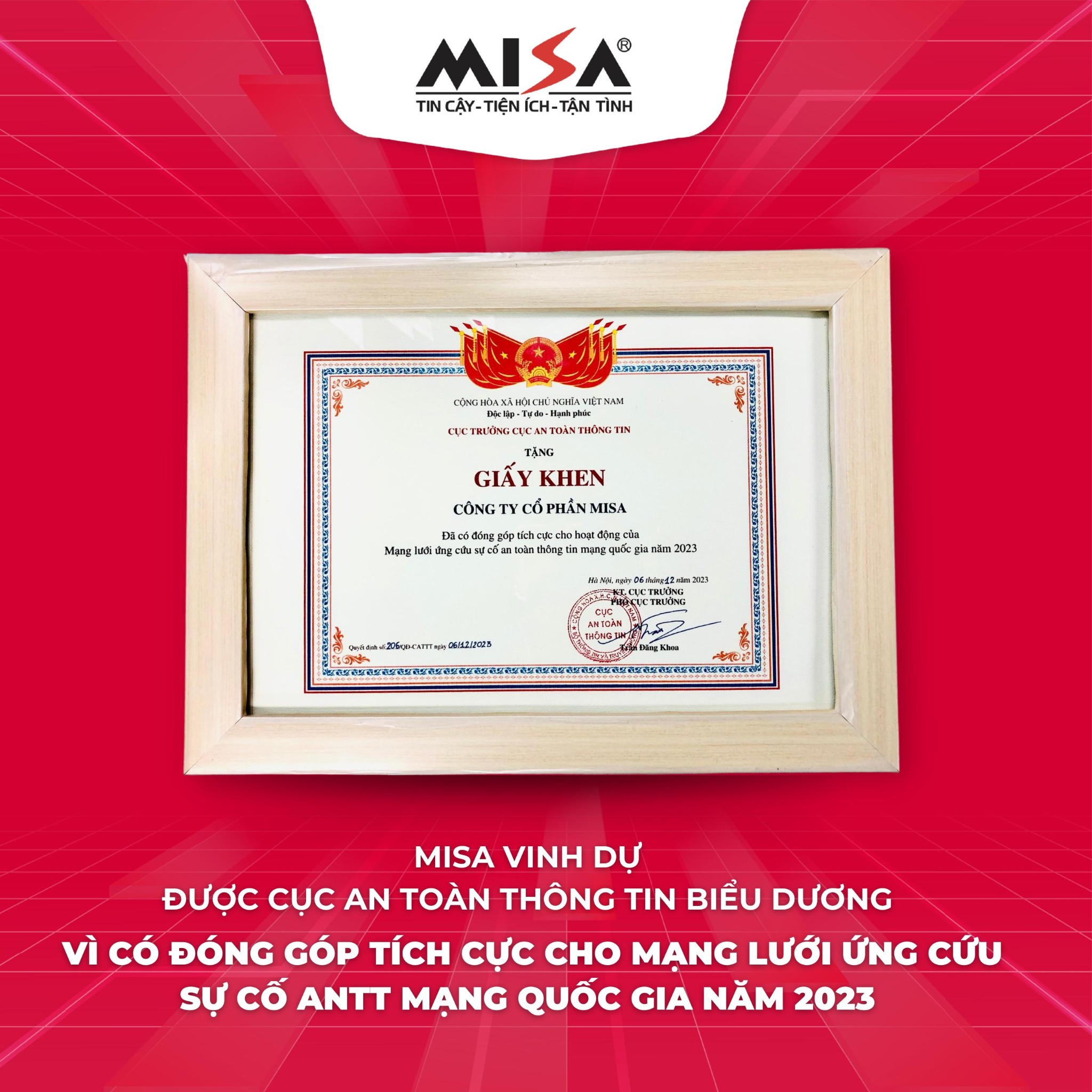Ngày 7/12/2023, tại Hội nghị giao ban Mạng lưới ứng cứu sự cố an toàn thông tin mạng quốc gia năm 2023, MISA là 1 trong 6 đơn vị vinh dự được Cục An toàn Thông tin (Bộ TT&TT) trao tặng bằng khen là vì có nhiều hoạt động đóng góp quan trọng cho sự phát triển chung của Mạng lưới trong năm vừa qua.