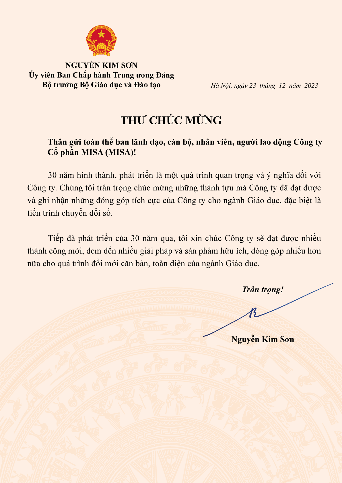 Nhân dịp 30 năm thành lập Công ty Cổ phần MISA (1994 – 2024), Bộ trưởng Bộ Giáo dục và Đào tạo Nguyễn Kim Sơn đã gửi thư chúc mừng tới Ban lãnh đạo và toàn thể Cán bộ nhân viên MISA. Công ty Cổ phần MISA xin trân trọng đăng tải toàn văn bức thư chúc mừng của Bộ trưởng.