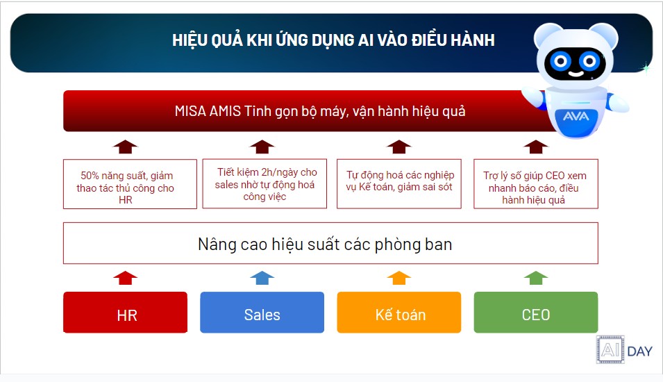 MISA đã tích hợp thành công trợ lý trí tuệ nhân tạo AVA vào nền tảng MISA AMIS hỗ trợ người dùng ứng dụng công nghệ vào công tác quản trị – vận hành doanh nghiệp hiệu quả hơn. Với trợ lý AVA, các CEO/ chủ doanh nghiệp có thể xem nhanh số liệu báo cáo về doanh thu, khách hàng, chi phí, công nợ, lãi/lỗ,… chỉ với một câu lệnh để ra quyết định điều hành kinh doanh một cách nhanh chóng, kịp thời. Đối với lĩnh vực nhân sự, trợ lý AVA còn hỗ trợ giảm thiếu các công việc thủ công và gia tăng 50% năng suất cho HR thông qua một số tính năng như tự động soạn thảo email tuyển dụng, nhận diện và trích xuất thông tin ứng viên từ ảnh chụp, CV,..Đối với lĩnh vực kinh doanh, trợ lý AVA là giải pháp giúp nhân viên kinh doanh tiết kiệm 2h đồng hồ mỗi ngày nhờ khả năng tự động hóa công việc, nâng cao tỷ lệ bán hàng thành công. Đối với lĩnh vực kế toán, trợ lý AVA giúp gia tăng năng suất gấp 5 lần, đồng thời có khả năng phân tích dữ liệu tài chính sâu sắc và đa chiều, giúp chủ doanh nghiệp hiểu rõ hơn về cơ cấu thu chi, lợi nhuận, và xu hướng kinh doanh, từ đó hỗ trợ quá trình nhà quản trị ra quyết định chiến lược.
