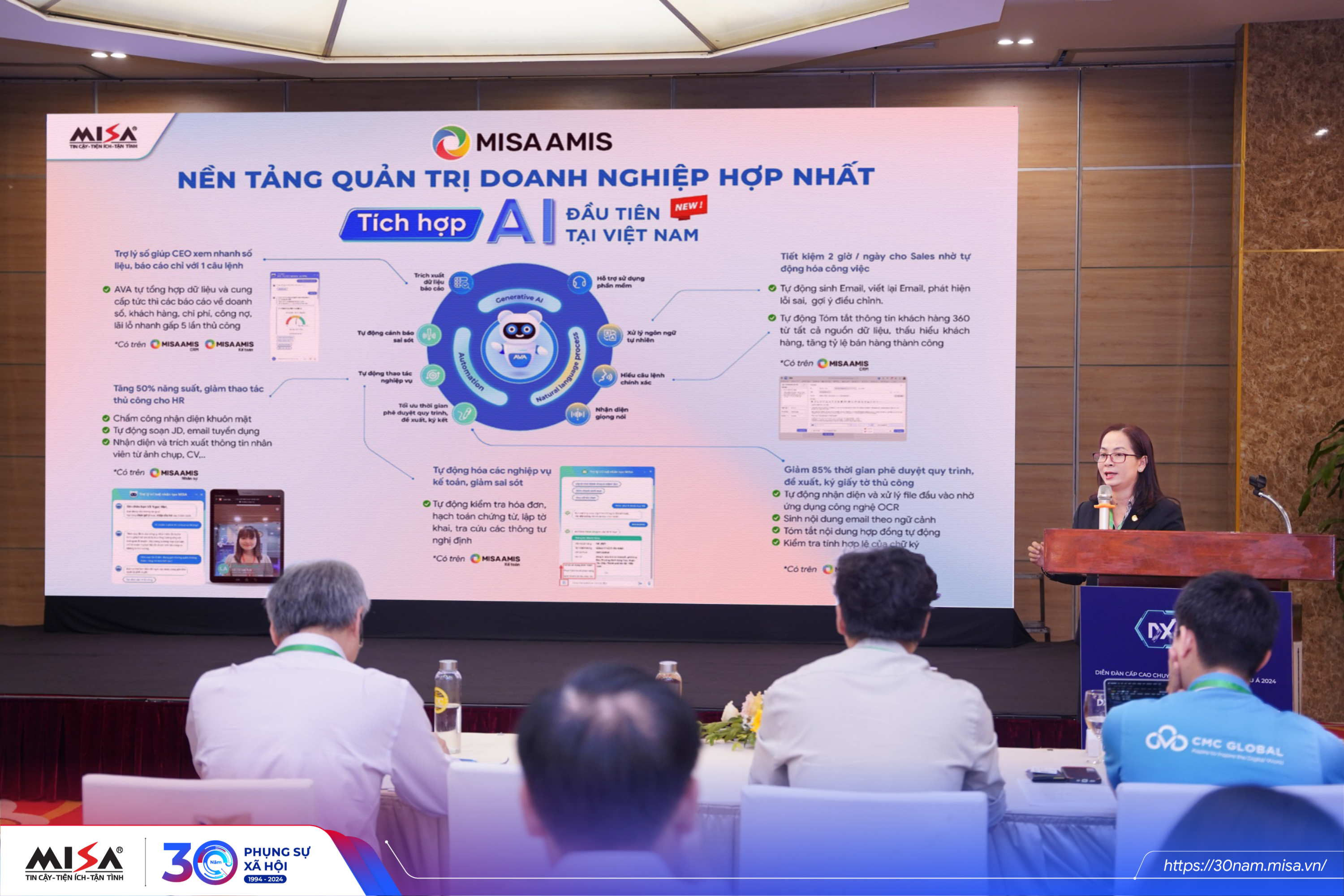 Tại phiên hội thảo, Giám đốc Trung tâm kinh doanh MISA Nguyễn Ngọc Lệ đã có bài tham luận với chủ đề: “Hệ sinh thái số giúp vận hành hiệu quả doanh nghiệp dựa trên dữ liệu”. Theo đó, nền tảng MISA AMIS là hệ sinh thái hợp nhất các nghiệp vụ quản trị doanh nghiệp trên một hệ thống, từ đó, cung cấp báo cáo đa chiều, trực quan giúp lãnh đạo doanh nghiệp có bức tranh toàn diện về tổ chức để đưa ra quyết định chiến lược, tối ưu hóa vận hành, nâng cao trải nghiệm khách hàng, tạo ra lợi thế cạnh tranh bền vững.