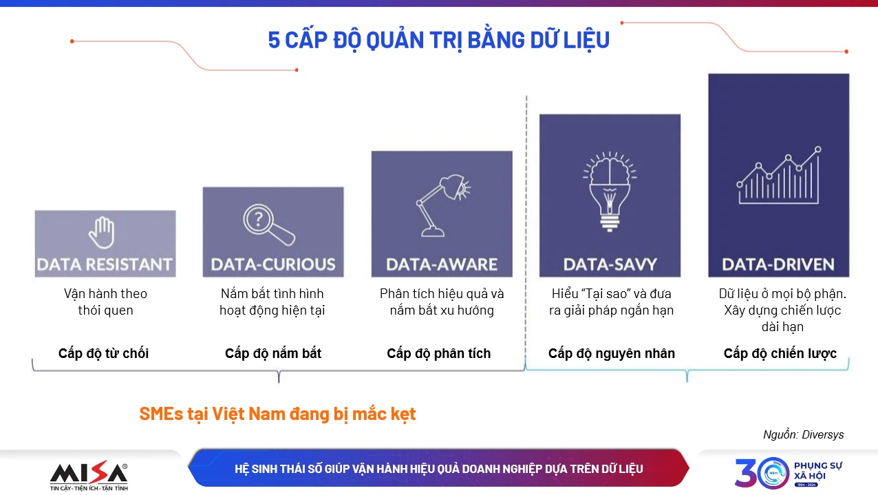 “Trong kỷ nguyên công nghệ, quản trị doanh nghiệp dựa trên dữ liệu đang trở thành một xu thế tất yếu. Tuy nhiên, nhiều doanh nghiệp nhỏ và vừa (SMEs) tại Việt Nam vẫn đang mắc kẹt ở cấp độ nắm bắt, chưa tận dụng được hết tiềm năng của dữ liệu để tiến lên các cấp độ cao hơn. Điều này cũng đòi hỏi SMEs cần có sự đầu tư toàn diện về chuyển đổi số, đào tạo nhân lực và thay đổi tư duy quản trị để có thể vượt qua các thách thức hiện tại”, bà Lệ nhấn mạnh.