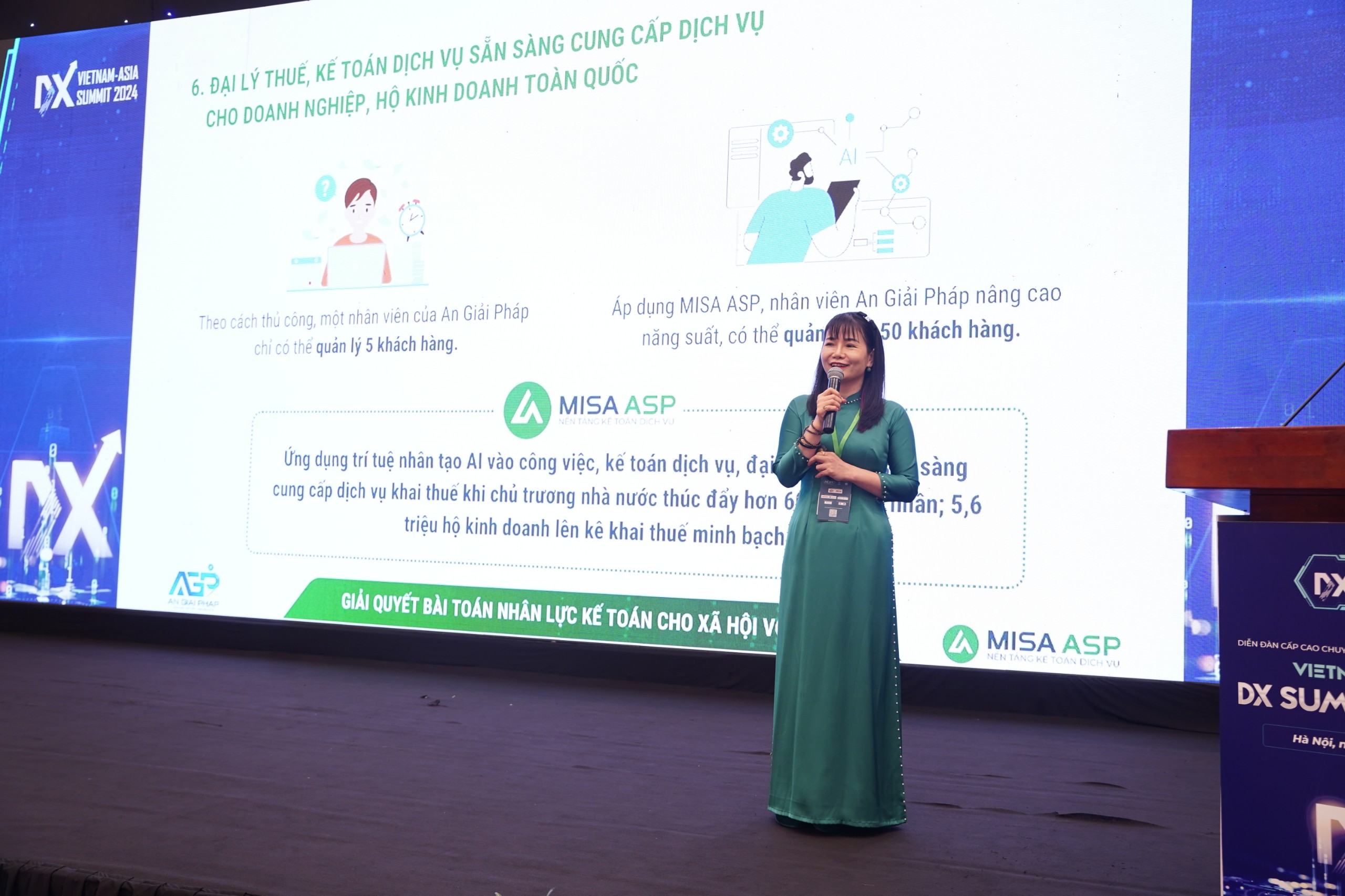 Tại phiên hội thảo “5G, AI cho chuyển đổi số, chuyển đổi xanh, phát triển kinh tế số” trong khuôn khổ Diễn đàn cấp cao chuyển đổi số Việt Nam – Châu Á 2024, bà Lương Thị Dinh – Tổng giám đốc công ty TNHH kế toán An Giải Pháp đã có bài tham luận về vấn đề giải quyết bài toán nhân lực kế toán cho xã hội với trí tuệ nhân tạo (AI) từ kinh nghiệm thực tiễn của công ty. Qua đó, tạo động lực để các đơn vị cùng ngành triển khai mạnh mẽ chuyển đổi số để mang lại giá trị tốt hơn cho khách hàng, tạo đà tăng trưởng mạnh mẽ và đóng góp vào sự phát triển của nền kinh tế.
