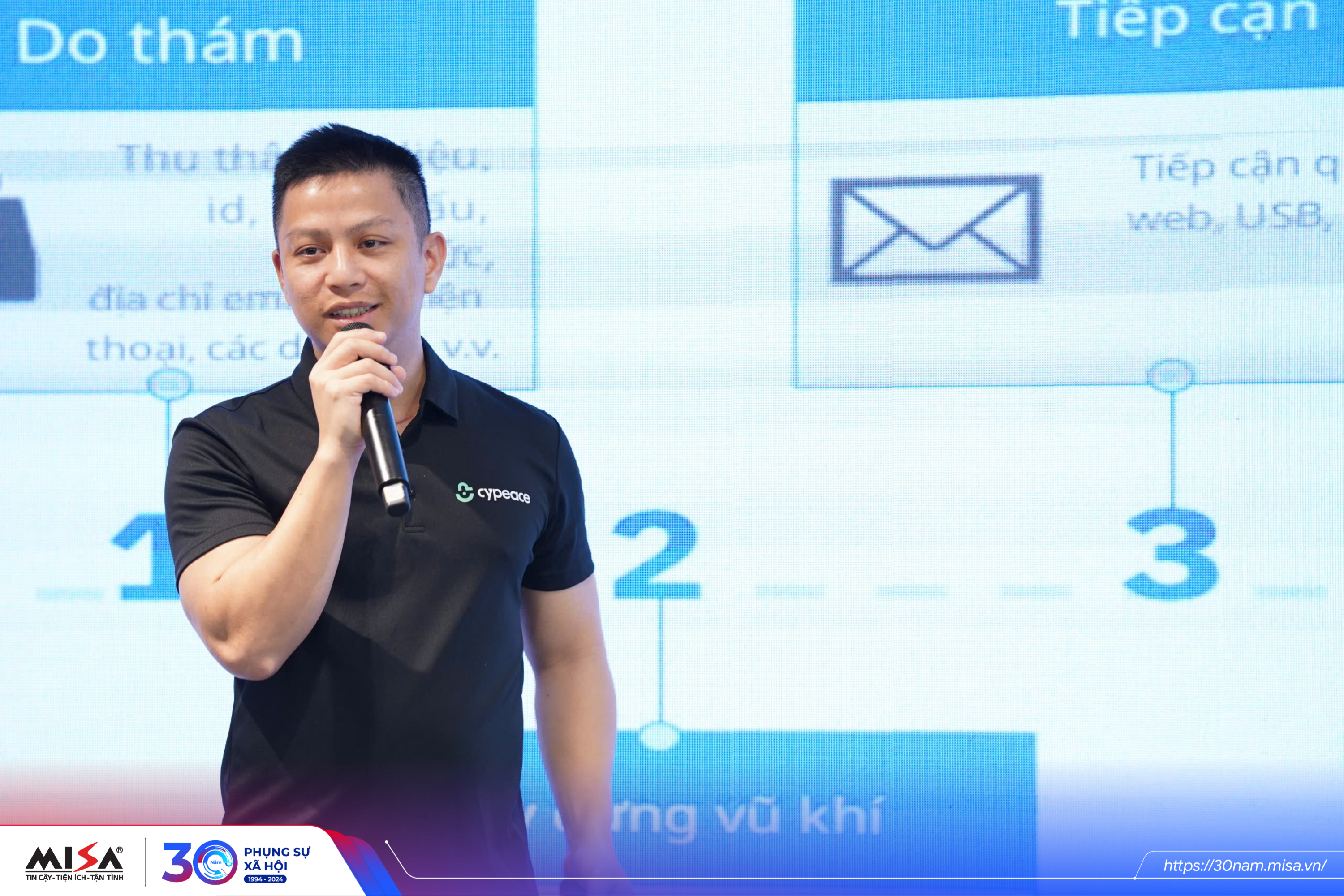 Chủ tich CyPeace, ông Ngô Minh Hiếu (Hiếu PC) đã chia sẻ về các mối nguy an ninh mạng phổ biến và mới nhất hiện nay, bao gồm cơ chế hoạt động, tác động mạnh mẽ của chúng đến các cá nhân cũng như doanh nghiệp, và phương pháp giúp doanh nghiệp phòng tránh những mối nguy này. Theo báo cáo tổng hợp của CyPeace, chi tiêu dành cho ATTT và quản trị rủi ro trên toàn cầu đạt khoảng 188,1 tỉ đô la năm 2023, tăng trưởng 14,2% so với năm 2022. Tuy nhiên, đi kèm với đó là những rủi ro về bảo mật và mất ATTT cũng ngày càng gia tăng nhanh chóng. Ông đề cập những con số đáng báo động, khi tổng số lỗ hổng được phát hiện và công bố năm 2023 đã tăng 11,1% so với năm 2022, trong đó các lỗ hổng mức cao và nghiêm trọng chiếm tỉ trọng xấp xỉ 56% xuất hiện trên các sản phẩm, phần mềm phổ biến trên thế giới. Nhận thức rõ về những mối đe dọa này, CyPeace cam kết thực hiện sứ mệnh của mình trong việc cung cấp các dịch vụ và giải pháp ATTT toàn diện, nhằm bảo vệ an toàn cho cả cá nhân và doanh nghiệp trên không gian mạng.