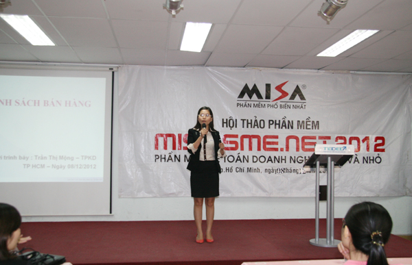 Ngày 08/12/2012, tại Hội trường toà nhà ITAXA (126 Nguyễn Thị Minh Khai, Q.3, TP. HCM) TT KDDN MISA Tp.HCM đã tổ chức hội thảo “Tư vấn chính sách thuế mới, Công tác chuẩn bị quyết toán tài chính, thuế năm 2012 & Triển khai giải pháp phần mềm kế toán MISA SME.NET 2012”. Hội thảo đã thu hút hơn 300 doanh nghiệp về tham dự.