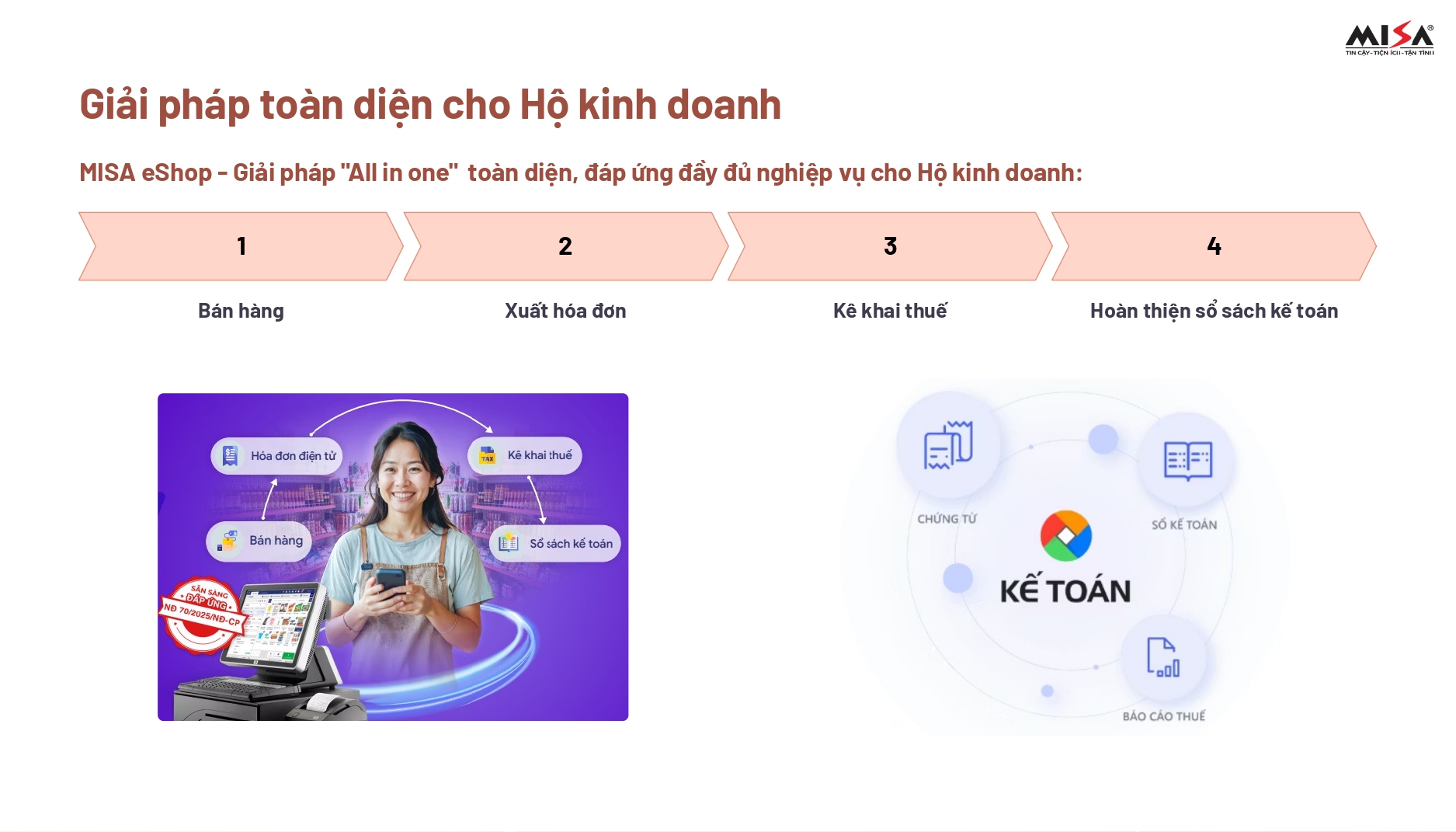 Đối với các hộ kinh doanh có quy mô lớn hơn, MISA cung cấp bộ giải pháp bao gồm phần mềm MISA eShop và phần cứng (là bộ máy POS), giúp hộ kinh doanh xuất hóa đơn kịp thời ngay khi bán hàng. Phần mềm MISA eShop cũng được kết nối trực tiếp với các giải pháp kế toán, thuế của MISA, nhằm tự động hóa các công tác nhập liệu, hạch toán và kê khai, nộp thuế điện tử ngay trên phần mềm. Bên cạnh đó, phần mềm còn được tích hợp với Nền tảng Kế toán dịch vụ MISA ASP, giúp kết nối trực tiếp với gần 24.000 chuyên gia kế toán – thuế, sẵn sàng phục vụ hàng triệu hộ kinh doanh chuyển sang hình thức kê khai, nâng cao tính chuyên nghiệp trong quản lý tài chính, chuẩn hóa kế toán, tuân thủ thuế và phát triển bền vững.