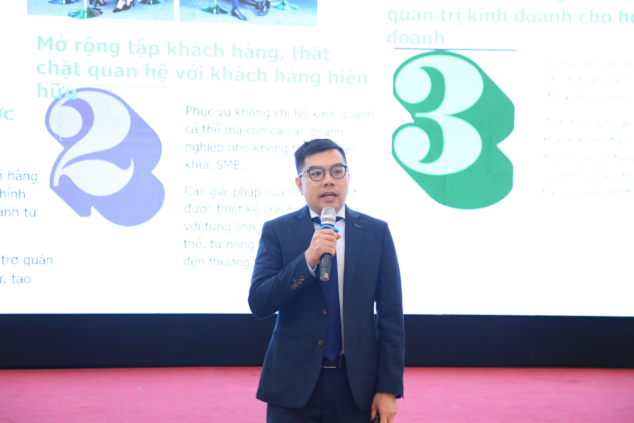 Tiếp nối các giải pháp số của MISA, ông Ngô Bình Nguyên – Giám đốc Phân khúc Hộ kinh doanh VPBank đã giới thiệu về các giải pháp tài chính phù hợp dành riêng cho hộ như gói vay V20K với lãi suất ưu đãi chỉ từ 3,99%/năm cho khoản vay thế chấp, hạn mức vay lên tới 20.000 tỷ đồng, hay mở thẻ tín dụng VPBank CommCredit với mức hoàn tiền lên tới 12%, hay các giải pháp tích luỹ sinh lời với lợi suất hấp dẫn lên tới 4,5% từ công cụ Super Sinh lời, đặc biệt phù hợp cho các khách hàng có dòng tiền nhàn rỗi trong ngắn hạn.