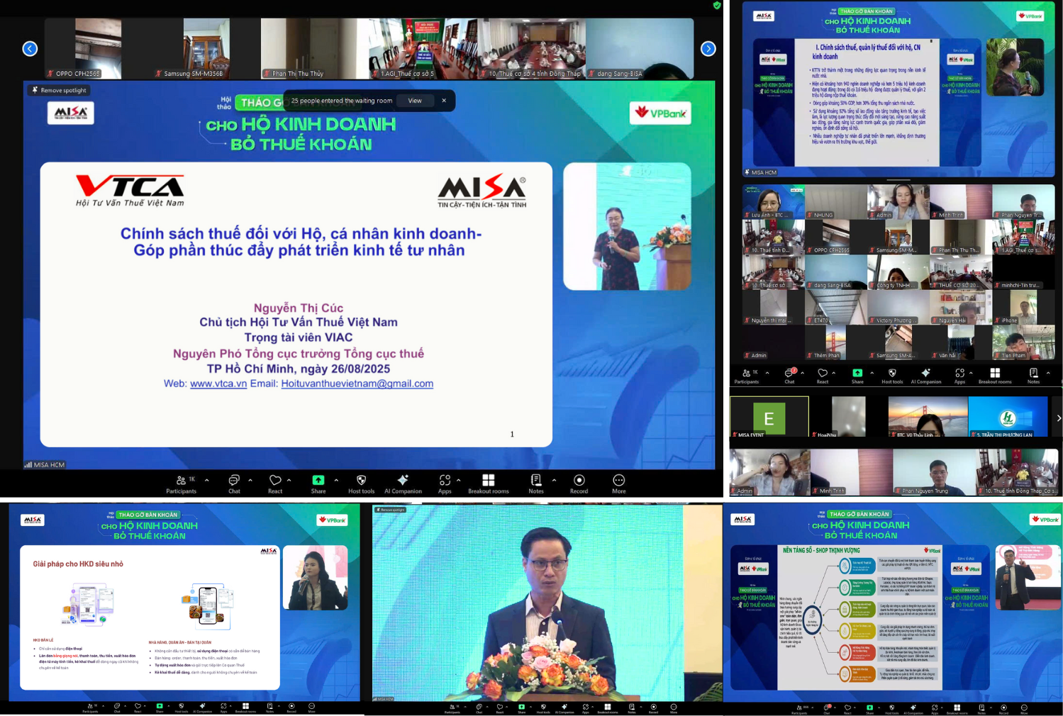 TP. Hồ Chí Minh, ngày 12/9/2025 – Hội thảo “Tháo gỡ băn khoăn cho hộ kinh doanh bỏ thuế khoán” được Công ty Cổ phần MISA và Ngân hàng TMCP Việt Nam Thịnh Vượng (VPBank) phối hợp tổ chức, thu hút sự tham dự của cơ quan thuế, chuyên gia tài chính – kế toán, cơ quan báo chí, cùng gần 500 hộ kinh doanh tham gia trực tiếp và hơn 3.000 hộ kinh doanh theo dõi trực tuyến. Sự kiện khẳng định tính cấp thiết của việc chuyển đổi từ thuế khoán sang kê khai, giải đáp kịp thời đến cộng đồng hộ kinh doanh.