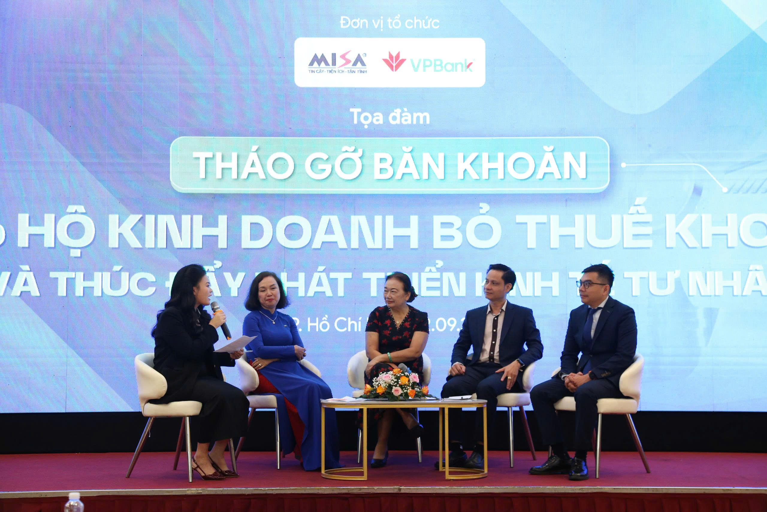 Trong khuôn khổ chương trình diễn ra phần tọa đàm “Tháo gỡ băn khoăn cho hộ kinh doanh bỏ thuế khoán và thúc đẩy phát triển kinh tế tư nhân” với sự tham dự của các diễn giả: bà Nguyễn Thị Cúc – Chủ tịch Hội tư vấn thuế Việt Nam, Nguyên Phó Tổng Cục trưởng Tổng Cục thuế; bà Lê Thị Thu Hương – Chủ tịch Hội tư vấn và Đại lý thuế TP. HCM, Nguyên Phó Cục trưởng Cục Thuế TP.HCM; ông Nguyễn Minh Tuấn – Phó Tổng Giám đốc Công ty Cổ phần MISA; Ông Ngô Bình Nguyên – Giám đốc phân khúc hộ kinh doanh VPBank qua phần điều phối của bà Bùi Thị Trang – Giám đốc Khối Giải pháp Bán lẻ MISA. Các diễn giả đã cùng thảo luận, phân tích quy định pháp lý và nghĩa vụ mới của hộ kinh doanh sau khi bỏ thuế khoán trong một số trường hợp cụ thể, các giải pháp công nghệ hỗ trợ hộ lập hóa đơn – quản lý sổ sách – kê khai cùng cơ hội tiếp cận vốn và dòng tiền để hộ kinh doanh chuyển đổi số thuận lợi và bền vững.